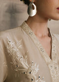 Nia from Samara by Mahgul is an elegant beige ensemble featuring a luxurious grip silk shirt, tailored raw silk trousers, and a soft, flowing chiffon dupatta. Meticulously curated, this refined look is perfect for making a sophisticated statement this spring.