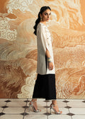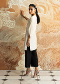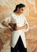 An ivory kurti in Korean raw silk paired with sleek black trousers, balancing contrast with understated charm. The ensemble carries Mahgul’s handwork as a quiet signature, turning simplicity into an expression of poised elegance.