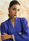A deep purple kurti in Korean raw silk paired with opulent jamawar trousers, blending regal tones with timeless tailoring. The ensemble is elevated through Mahgul’s intricate handwork, adding dimension and finesse to its rich, statement presence.