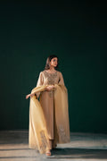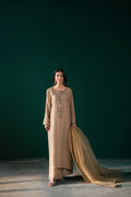 A modern, elegant beige long shirt featuring neckline embellishments, paired with classic azaar pants and a delicate organza dupatta adorned with motif patches for a charming finish..