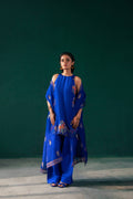 Sleeveless short shirt in blue pure raw silk featuring subtle embellishments and classic block print, paired with a plain blue farshi shalwar and an organza dupatta with matching block print detailing..