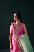 Candy pink sleeveless short shirt in self Karandi with elegant neck embellishment and allover front and back spray, paired with a plain Karandi farshi shalwar and a turquoise dupatta adorned with light embellishment, laces, and tassels..