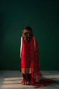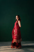 A maroon organza shirt adorned with stunning golden sequin work, paired with a matching organza dupatta and raw silk crushed trousers for a luxurious and elegant ensemble.