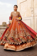 Depicting Mughal artistry amidst blooming gardens, this hand-embroidered Angrakha Set in vibrant shades of rust and red is brought to life by our master artisans. Their art is further enhanced with our signature gota patti hand embroidery along with embellishments of kinari, dabqa, naqshi and sequins.