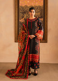 This outfit features a long black shirt with striking red and orange print, creating a bold and elegant look. It is paired with cigarette pants that echo the same rich color palette. The ensemble is completed with a Monark silk dupatta, showcasing intricate floral and traditional design