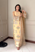 Embrace soft elegance in this Pastel Yellow 3-piece pret set, featuring a breezy organza shirt paired with grip trousers and a dreamy net dupatta. The boat neckline with a subtle slit is enhanced with delicate looped pearl detailing for a graceful finish. Intricate embroidery adorns the shirt and sleeves, complemented by playful tassel accents and a soft inner lining for comfort. The trousers feature an embroidered border that adds a refined edge. Completing the look is a net dupatta with a sparkling all-over sequin spray and four-sided lace-trimmed borders—perfect for festive flair or summer soirees.