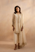 In a delicate shade of afterglow, this 3-piece ensemble speaks softly of elegance. The soft V neckline and front-open silhouette with a rounded hem create a graceful frame, while paisley embroidery glimmers with tilla thread detail. Fabric buttons grace the slit with subtle charm. Paired with a straight, plain-dyed trouser and a matching organza dupatta, bordered on all four sides with fine embroidery, this design