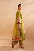 In the serene hue of White Grape, this 3-piece ensemble exudes refined charm. The V-neck straight shirt features an elegantly embroidered neckline, with contrasting embroidered organza borders adorning the sleeves, sides, and hem—each detail adding a graceful flourish. Paired with same-tone grip trousers for a clean silhouette, and tailored with a fixed front, side zipper, and elasticated back for comfort. The look is completed by a soft organza dupatta, finished with four-sided contrast embroidered borders and delicately adorned pallus—a timeless expression of subtle sophistication