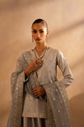 Step into sophistication with this 3-piece pret in a serene Cool Grey hue, featuring an exquisitely tailored Organza Silk shirt and trouser duo. Finished with a sheer Organza dupatta, it’s the epitome of graceful modernity.