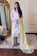 Elevate your style with this exquisite Pink 3-piece pret ensemble, designed to blend tradition with modern flair. The boat-shaped neckline with slit complements the color block straight kurta, featuring intricate embroidery with satin and printed borders for a striking statement. Straight sleeves echo the color block artistry, enhanced with satin-embroidered and printed detailing. The ensemble is perfectly paired with a Rajo net dupatta, delicately adorned with embroidered scalloped borders for a soft, romantic finish. Printed straight pants add a trendy twist, making this look both elegant and effortlessly fashion-forward.