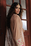 Radiate opulence in this Gold Silver 3-piece micro velvet outfit, featuring an embroidered round neckline with a slit, adorned with printed chatta patti piping and delicate buttons. The flared sleeves boast heavy embroidered borders, while the floral embroidered hem is accentuated with a luxurious tissue border. Paired with flared Korean silk trousers featuring embroidered hems and a silk printed dupatta with embroidered border detailing, this ensemble defines festive elegance.
