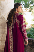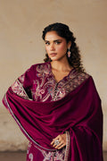 Make a grand statement in this Plum 3-piece pret ensemble. The micro velvet shirt features a long open jacket-style silhouette with a scalloped V neckline adorned with embroidered buttons, exuding timeless elegance. The heavily embroidered design is accentuated with intricate borders, while fitted sleeves add a touch of sophistication. Paired with flared Korean silk trousers detailed with embroidered hems and a graceful Russian silk dupatta, this look defines luxury and modern glamour.