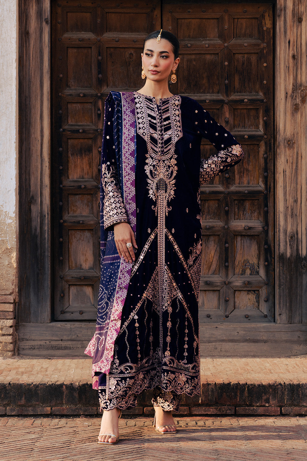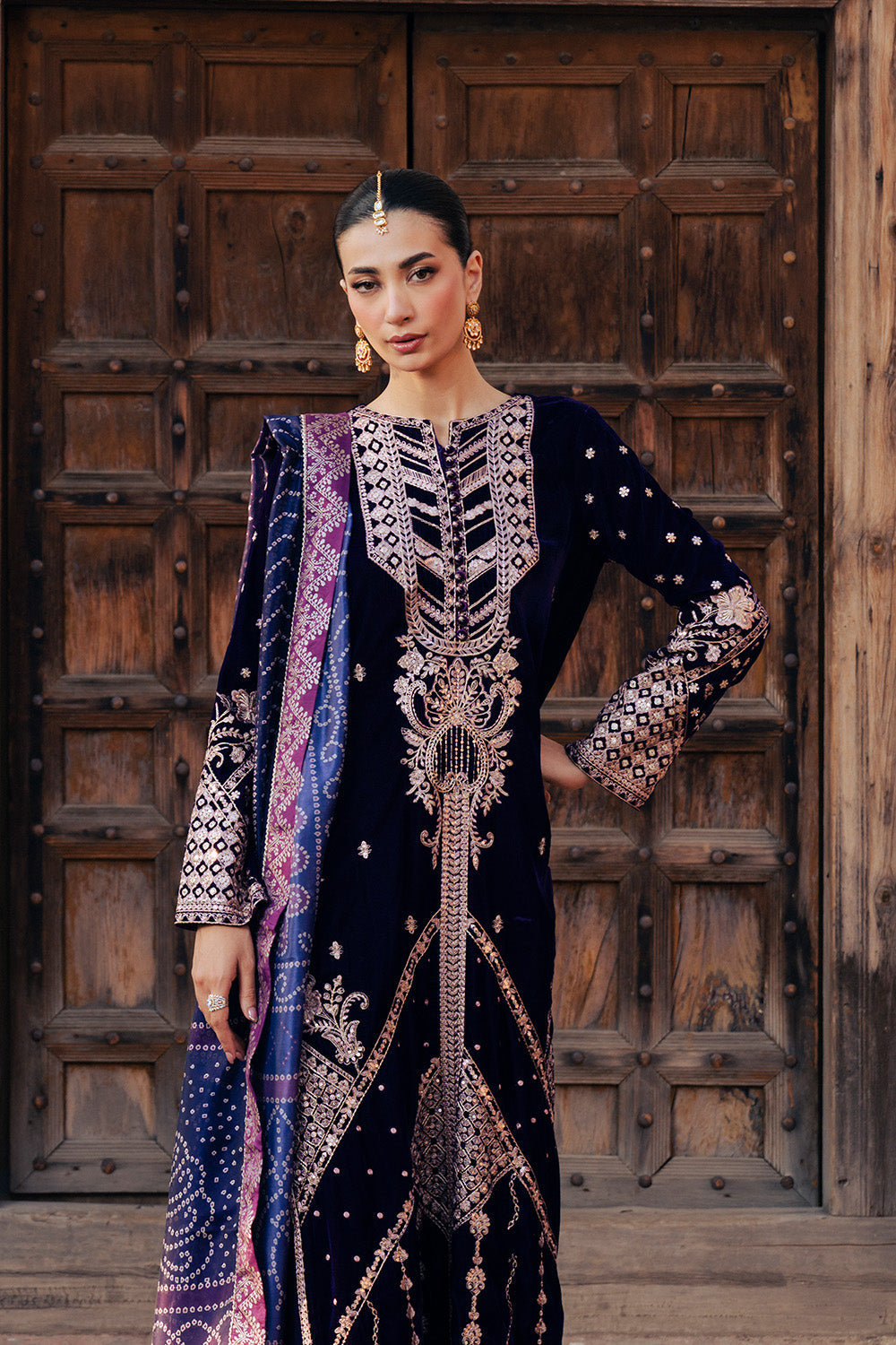 Step into timeless elegance with this Purple 3-piece micro velvet ensemble, exuding sophistication and luxury. The shirt features an embroidered crew neckline with slit detailing, loop buttons, and intricate all-over embroidery finished with a beautifully crafted border on the hem. Embroidered sleeves add to its refined charm, while the straight grip trousers with scalloped embroidered hems complete the look with grace. Paired with a medium silk printed dupatta adorned with delicate hand-printed borders, this outfit is a perfect blend of tradition and contemporary style.