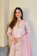 Immerse yourself in soft sophistication with this 3-piece pret ensemble in the enchanting shade of Mauve Chalk. The lawn shirt features a round neck with a deep V-slit and is fully embroidered to perfection, blending modern grace with timeless detail. Delicate embroidery paired with plain organza accents adorn the sleeves, while the hem is finished with intricately embroidered scalloped borders for a refined finish. A pair of plain straight cambric cotton trousers offers a balanced silhouette. The net dupatta is a vision of sheer charm, enhanced with scalloped embroidered borders that float with effortless elegance. A statement look for refined summer gatherings.