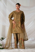 Shirt: Embroidered Front (Zari Silk) 1 Pc Dyed Back, Sleeves (Zari Silk) 1.60 Yards Embroidered Sleeves Opening Patti (Organza) 1.35 Yards Embroidered Sleeves Shoulder Patti (Organza) 1.35 Yards Embroidered Back Daman Patti (Organza) 0.85 Yard Embroidered Front, Slit Patti (Organza) 1.15 Yards Embroidered Button (Korean Silk) 15 Pcs Fabric: Zari Silk + Organza Dupatta: Embroidered Dupatta (Net) 2.75 Yards Fabric: Net Trouser: Trouser (Korean Silk) 0.50 Yard Embroidered Trouser (Korean Silk) 2.50 Yards Fabric: Korean Silk Color: Brown Design: Embroidered.