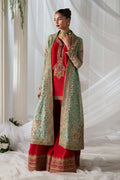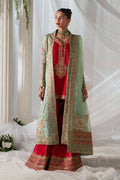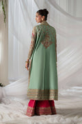 An enchanting masterpiece in Grayed Jade, this 3-piece pret exudes timeless elegance with its luxurious Korean Silk gown and straight inner shirt. The front-open long gown is adorned with delicate all-over floral embroidery, while a side-slit open style creates a graceful, flowing silhouette. Featuring a round neck with a deep “V” cut, the neckline is richly detailed with heavy embroidery and intricate button accents. The full-length fitted sleeves shimmer with embroidered artistry, adding sophistication to the overall design. A sleeveless straight inner layer enhances the modern charm of this look. Paired with fully flared trousers, highlighted with lace and an embroidered hem border, this ensemble strikes the perfect balance of refinement and grace. Completing the outfit, the organza dupatta with 4-side embroidered borders drapes beautifully, bringing a regal finish to this striking attire. 3 Piece Pret Gown Fabric: Korean Silk Trouser Fabric: Korean Silk Dupatta Fabric: Organza Color: Grayed Jade.