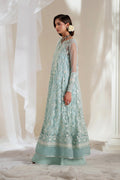 Gracefully designed in a serene Glacier hue, this 3-piece pret exudes timeless charm. The long A-line shirt with side flares is adorned with delicate all-over embroidery and shimmering sequins, complemented by a slit-V neckline with an intricately embroidered panel. Full-length sleeves with embroidered cuffs and lace detailing add a refined finish. The hemline is styled with an embroidered border, enhancing its elegance. Paired with straight wide-leg grip trousers featuring lace-detailed panels for a modern silhouette. The look is completed with a net dupatta, beautifully bordered on all four sides with intricate embroidery. 3 Piece Pret Shirt Fabric: Net Trouser Fabric: Grip Dupatta Fabric: Net Color: Glacier.