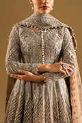 Step into timeless elegance with this pret suit ensemble in a captivating Ancient Scroll hue. The floor-length net maxi is adorned with full-body silver hand embroidery and glimmering sequins, creating a statement of opulence. Featuring exquisite zari, crystal, sequins, and beadwork embellishments, every detail is meticulously handcrafted. The multi-panel flare boasts intricate radial and linear embroidery for maximum volume and graceful movement. Styled with full-length embroidered net sleeves, it adds a regal charm to the silhouette. The matching net dupatta sparkles with an all-over sequin spray and ornate border detailing. Comes with an attached inner lining for comfort and finish, making it a true masterpiece of festive couture.