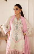 Auri is a dreamy ode to summer elegance. Rendered in soft ivory crepe, this flowing silhouette is brought to life with dainty florals and delicate hand-embellished accents that whisper femininity. The blush pink silk dupatta adds an irresistible touch of luxury, while the ombré printed shalwar completes the look with subtle drama..