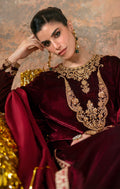 Lustrous, opulent and awash with spell binding modernity. A gorgeous, deep red blood shirt cut from plush velvet with intricately hand embellished neckline with kora and dabka in regal gold blooms the front and sleeves of the shirt to provide an uplifting