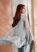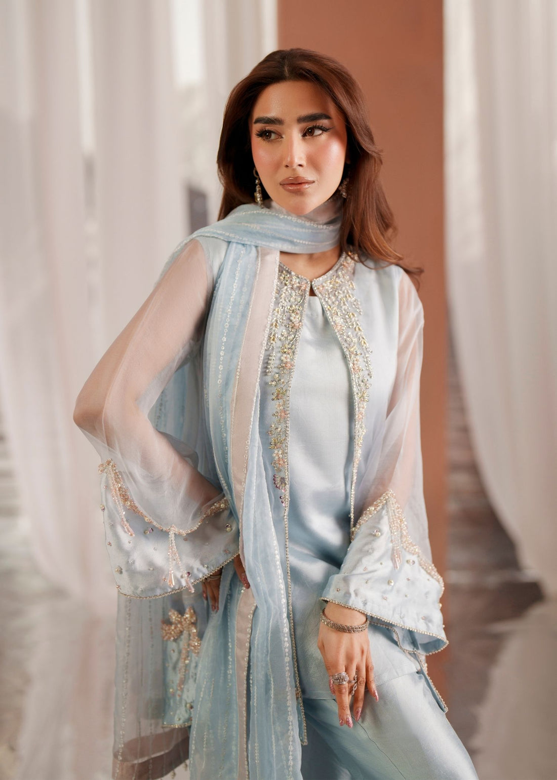 Aura is crafted on delicate organza, featuring a short ice-blue jacket with heavy crystal work