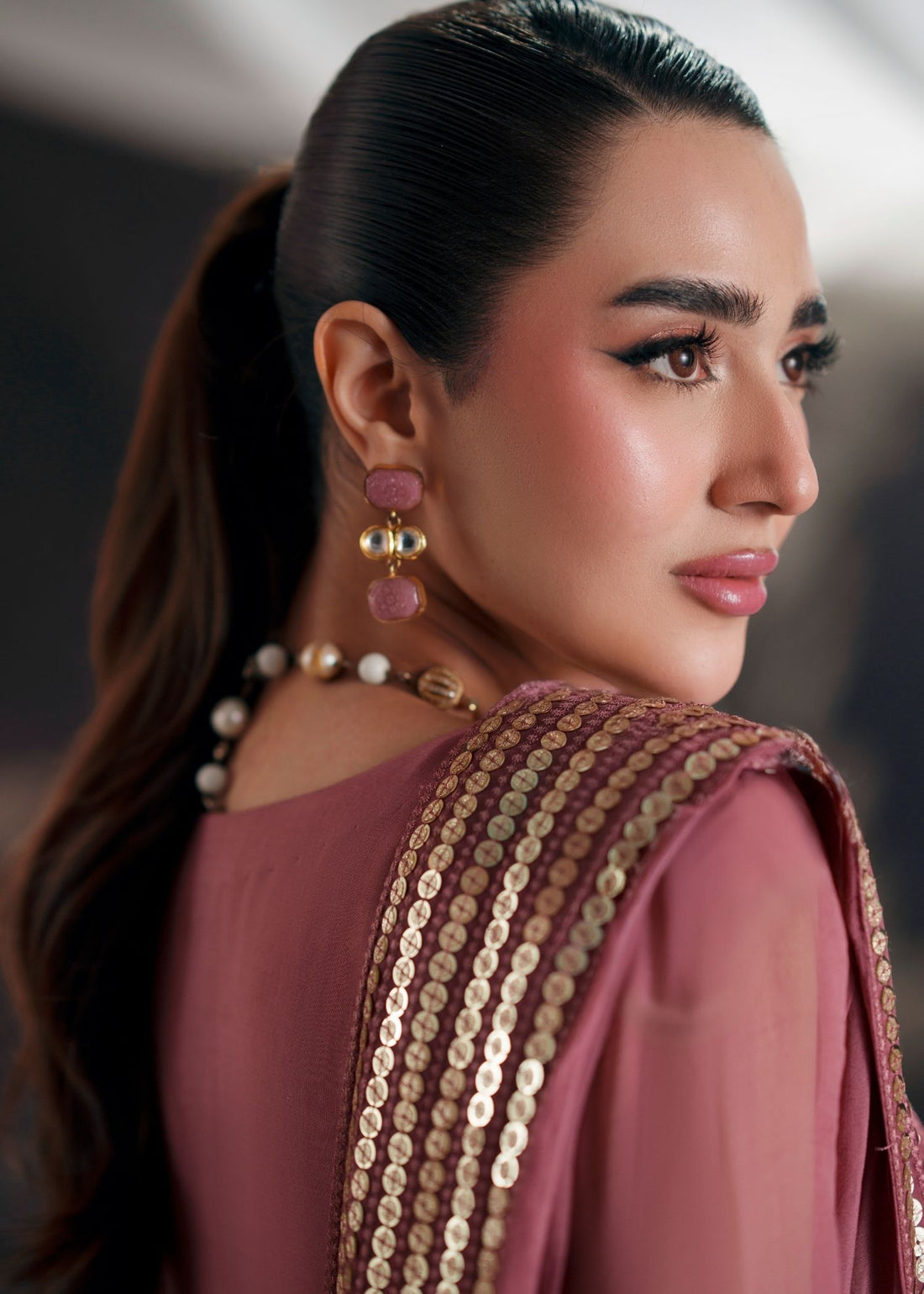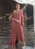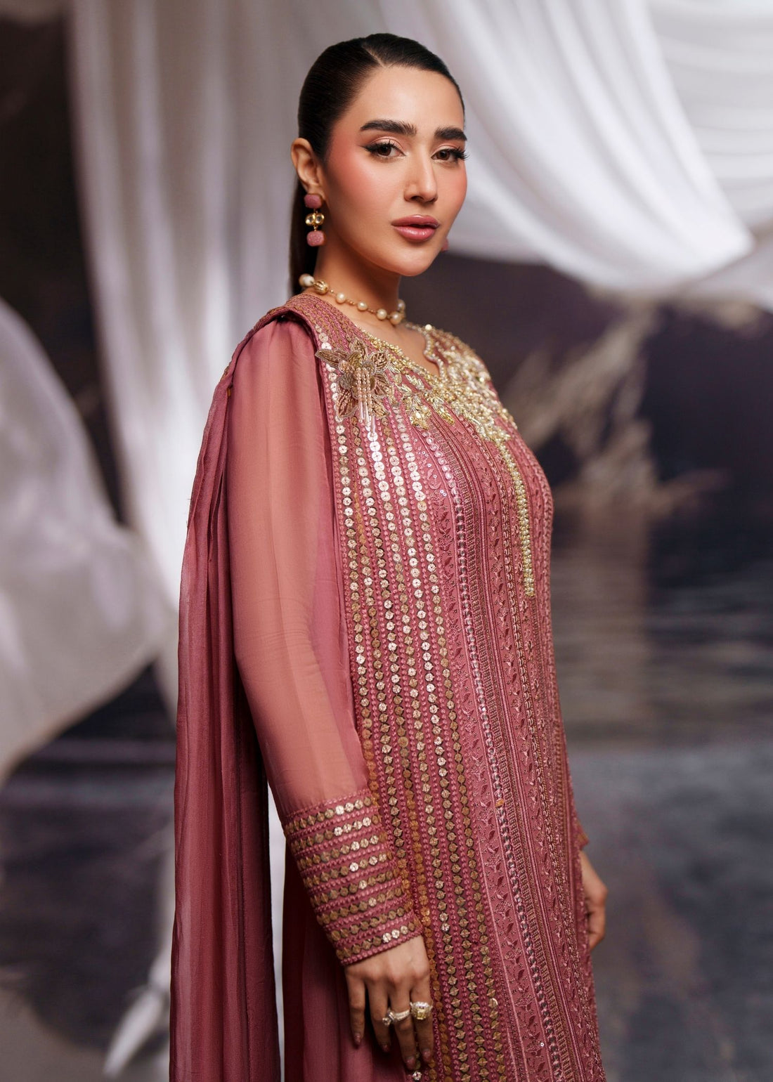 Cyra is crafted in chiffon in a vibrant deep rose-pink tone, featuring a hand-embellished shirt with heavy embroidery. Styled with a raw silk embroidered trouser and an attached dupatta, the ensemble highlights refined detailing and year-round elegance.
