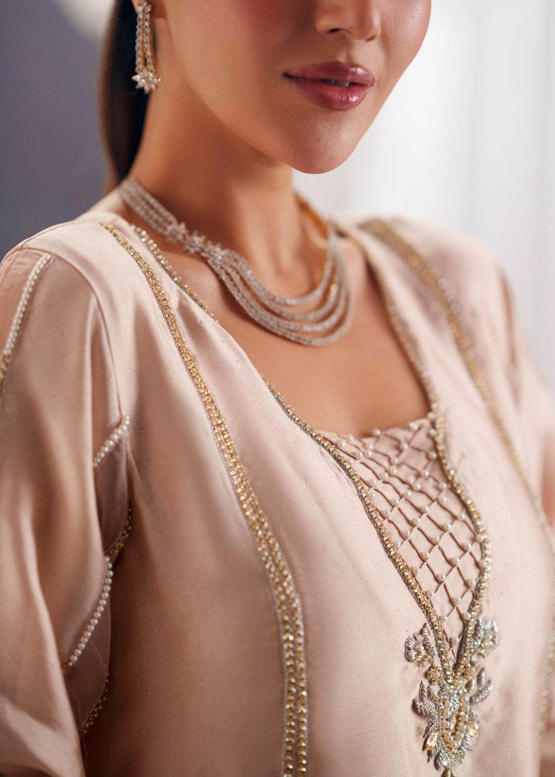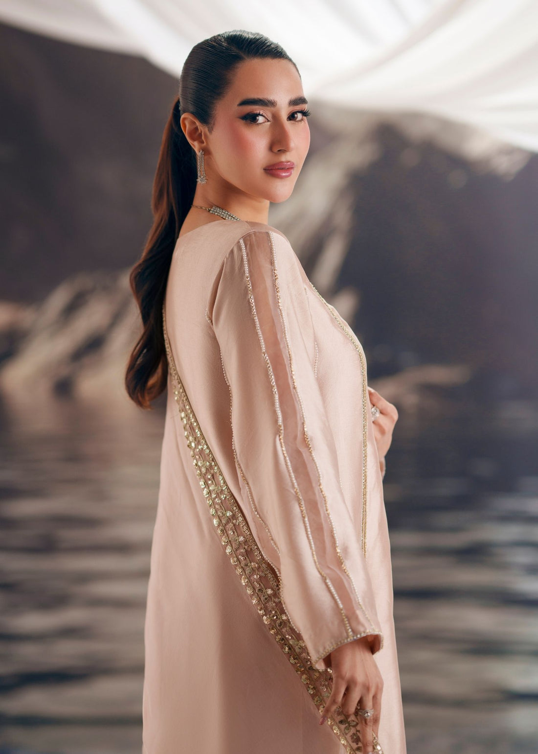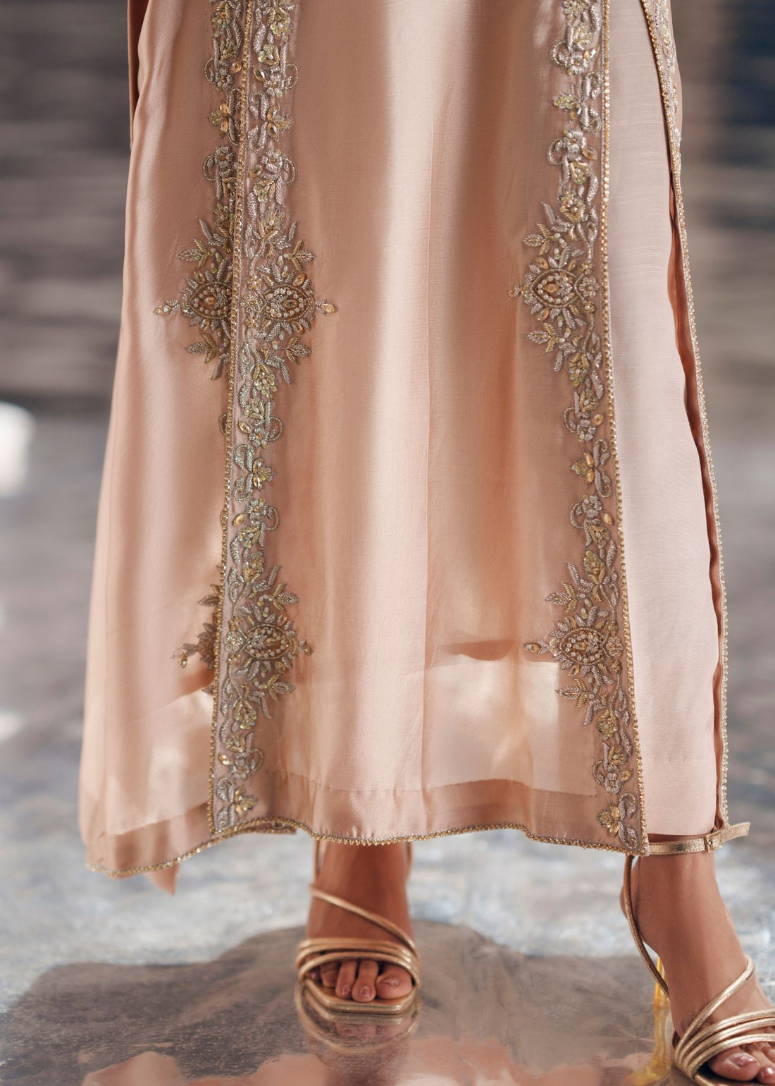 Fiona showcases a pure Shesha silk peach long shirt with elegant side slits. Paired with a raw silk trouser and a silk embroidered dupatta, it reflects exquisite craftsmanship and timeless appeal for all seasons.