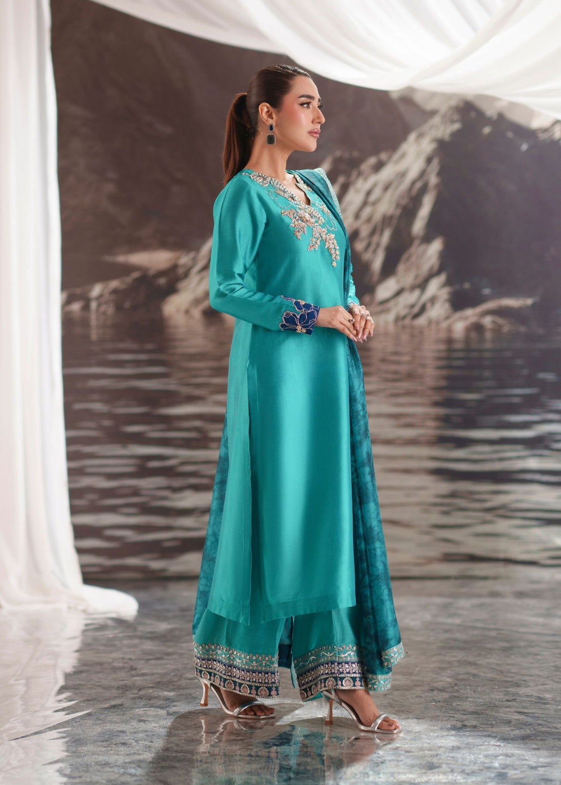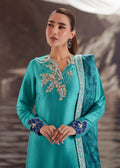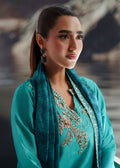 Lumi is crafted in pure Shesha silk in a vibrant turquoise tone. Styled with a raw silk embroidered trouser and a silk printed dupatta, the ensemble highlights refined detailing and year-round elegance.