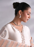 Featuring 'Opal' an elegant formal outfit, made from pure sheesha silk in a soft off-white color. The shirt is subtly adorned with delicate handwork on the neckline and sleeves, incorporating pearls, stones, crystals, and dabka, adding an understated touch of sophistication. It is paired with a silk dupatta, beautifully embroidered with a contrasting peach-colored border, enhancing its graceful appeal. Completing the look, the outfit is paired with a loose shalwar, offering a traditional touch to this refined and timeless ensemble.