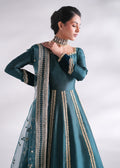 Introducing 'Zircon', a regal formal pishwas crafted from pure sheesha silk in a sophisticated zinc color. The pishwas showcases delicate, old-school handwork, featuring intricate gota naqshi, stones, crystals, and dabka, adding timeless elegance. The velvet detailing along the hem further enhances its vintage charm, creating a graceful, classic look. Paired with a beautifully sequins-embroidered organza dupatta and sleek cigarette pants, 'Zircon' is the perfect blend of tradition and contemporary sophistication, making it an ideal choice for special occasions.