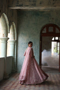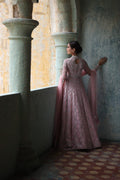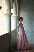 Look ever so graceful in hand-beaded pearls on a sea of pink silk net fabric in the premiere outfit of the Nissa Collection. The elegant collar, delicate kaam on the bodice and interlacing pearl patter dazzles anyone who looks upon this gorgeous outfit.