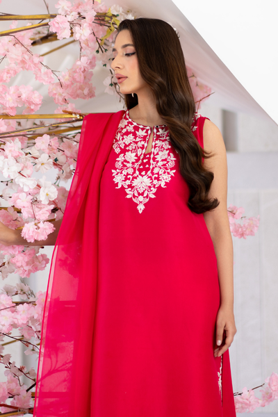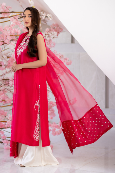 This classic kurta in a vibrant fuschia color is sure to turn heads this season! With contrasting white embroidery and sheesha details, this outfit will be a staple in your spring/summer wardrobe. Can be paired with culotte pants for extra flair!