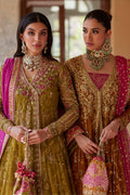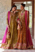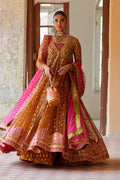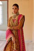 Stun in this elegant saffron front-open pishwaas that features a contrasting pink dupatta and slip. Gilded in glistening gold, the pishwas features a gold floral handwork and an intricate orange and pink border with striking dabka and zardozi kaam. Complete the outfit with a beautiful potli bag.