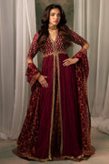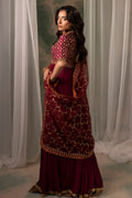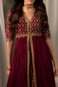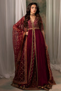 A maroon front-open jacket pishwas, exquisitely embellished with dabka, nakshi, Swarovski, and crystals, paired with a jaal net dupatta inspired by Mughal geometric patterns. The ensemble is completed with a lower lehenga featuring two distinct printed patterns, also inspired by Mughal art, creating a harmonious blend of traditional artistry and contemporary design.