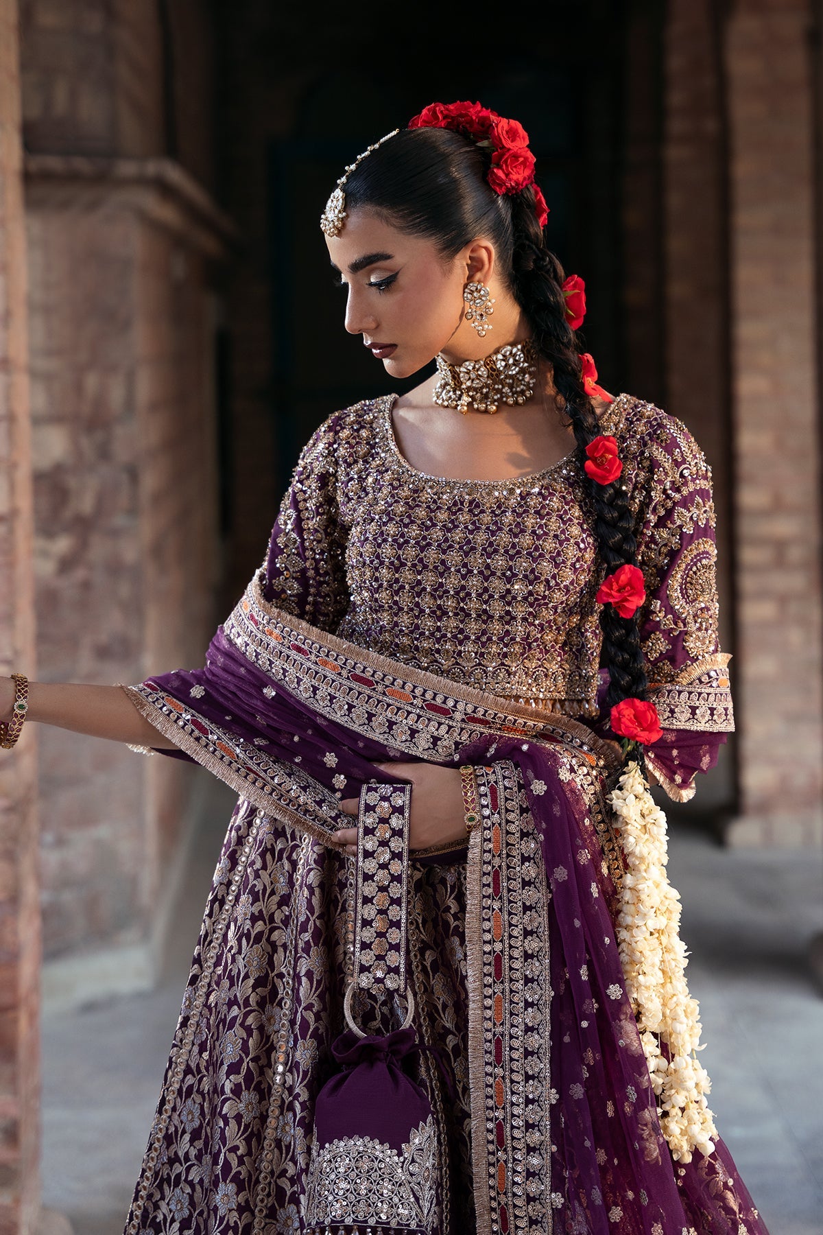 Jamawar Lehenga with embroidery of tilla and Sequins, resham work details and Heavy Hand embellished choli With sleeves.