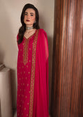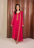 Turn heads in Aarzoo, a vibrant expression of elegance in striking shocking pink. This exquisitely embroidered chiffon shirt is paired with a matching embroidered chiffon dupatta, elevated by organza borders for a refined finish. The raw silk trouser completes the ensemble, making it a stunning choice for festive occasions, formal events, or celebrations where statement style is a must.