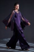 In a rich plum hue, this ensemble layers a dramatic organza jacket, its dramatic wide flared sleeves embroidered with sprawling floral motifs, over a silk inner shirt. The shirt’s neckline is detailed with intricate cutouts and delicate beadwork, an exquisite counterpoint to the jacket’s bold ornamentation. Boot-cut trousers, dramatically cut, are adorned with lace peeking out from their cuffs, echoing the lace accents on the shirt hem, creating a seamless harmony of texture, color, and detail.