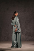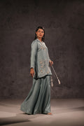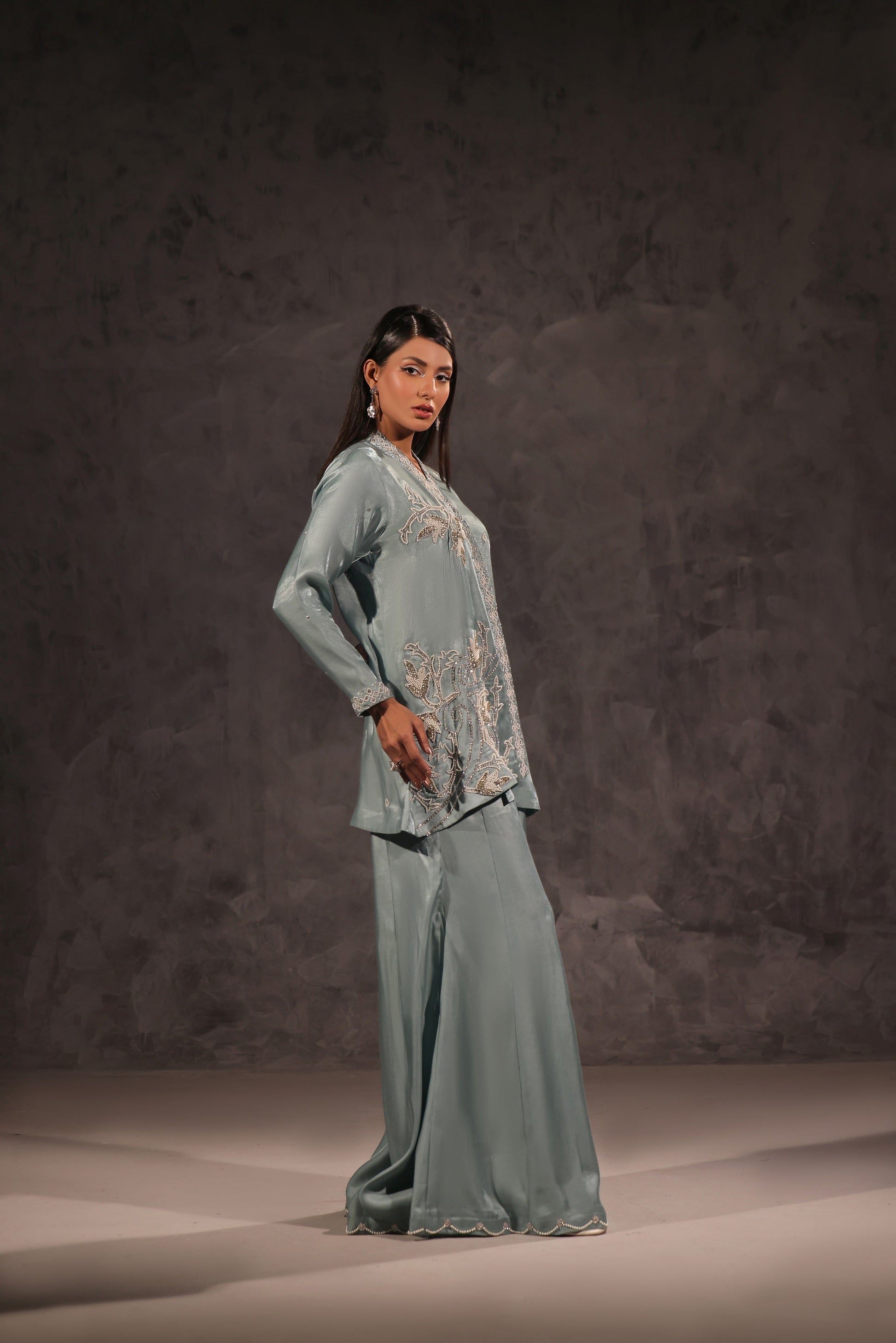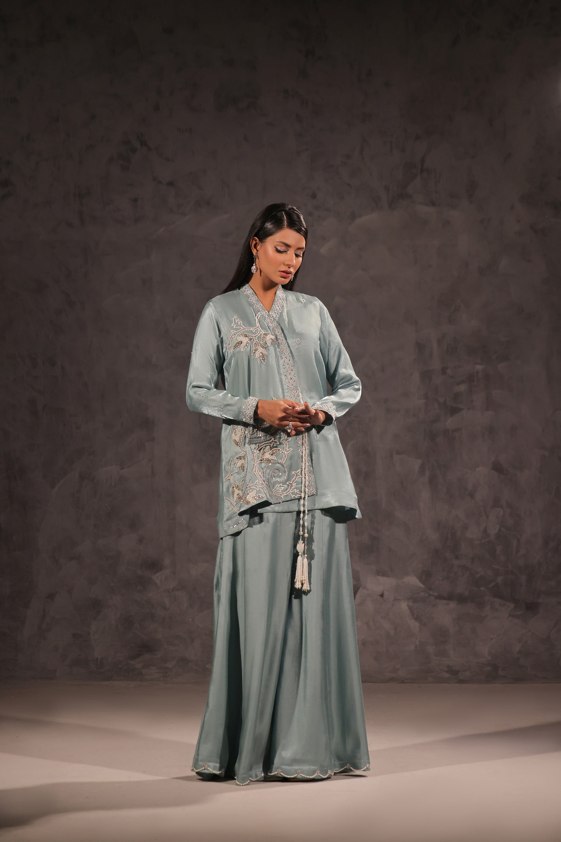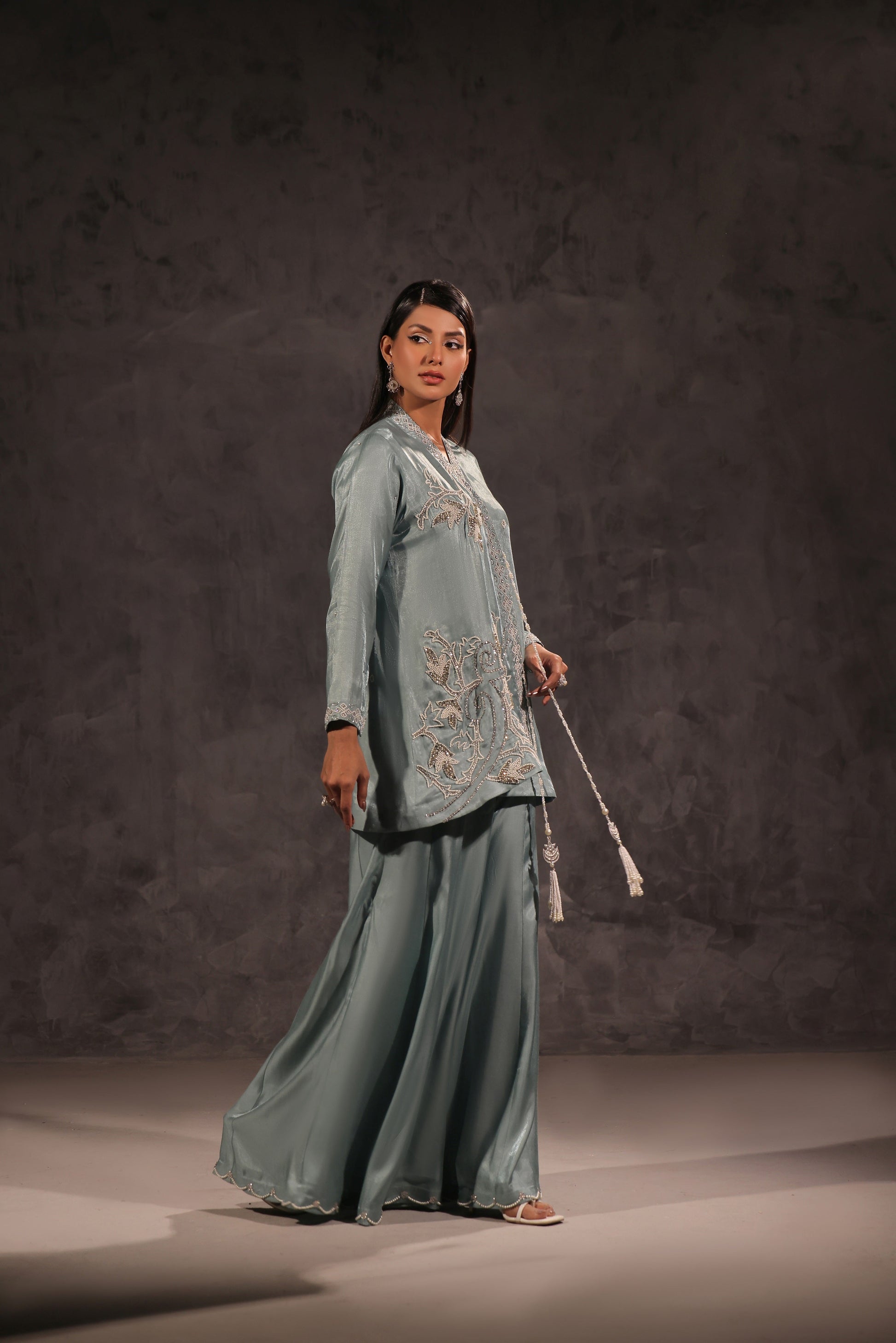 Elevate your style with our stunning 2-piece suit. The Iceblue shimmer lambha side open cut, adorned with pearl and diamontee work, offers an elegant touch. The hand embellished scallops on the Damaan front sleeves and back add a touch of sophistication. Complete the look with the Dhaka pajama, featuring delicate scallops on the ends. Perfect for any special occasion.