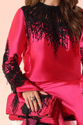 A bold interplay of contrast, Dark Romance fuses the vibrance of hot pink with the depth of black. The long shirt features asymmetrical sleeves and intricate embroidery, elevated by the signature MS neckline — crafted from organza strips and adorned with delicate pearl handwork. Finished with a gorgeous flowing dupatta, this piece is a striking statement in contemporary elegance, where color and craftsmanship collide in perfect harmony.