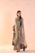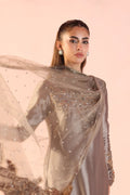 A statement in modern regality, Whispers of Opulence stands out in a rare steel silver hue, a Musferah Saad exclusive. The long silhouette is enriched with antique tilla embroidery along the neckline and hem, designed with a distinctive asymmetrical flow. Paired with an embroidered polka-dot net dupatta featuring cutwork tilla corners and finished with a soft tissue edging, the ensemble strikes the perfect balance of understated elegance and intricate craftsmanship.