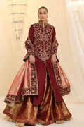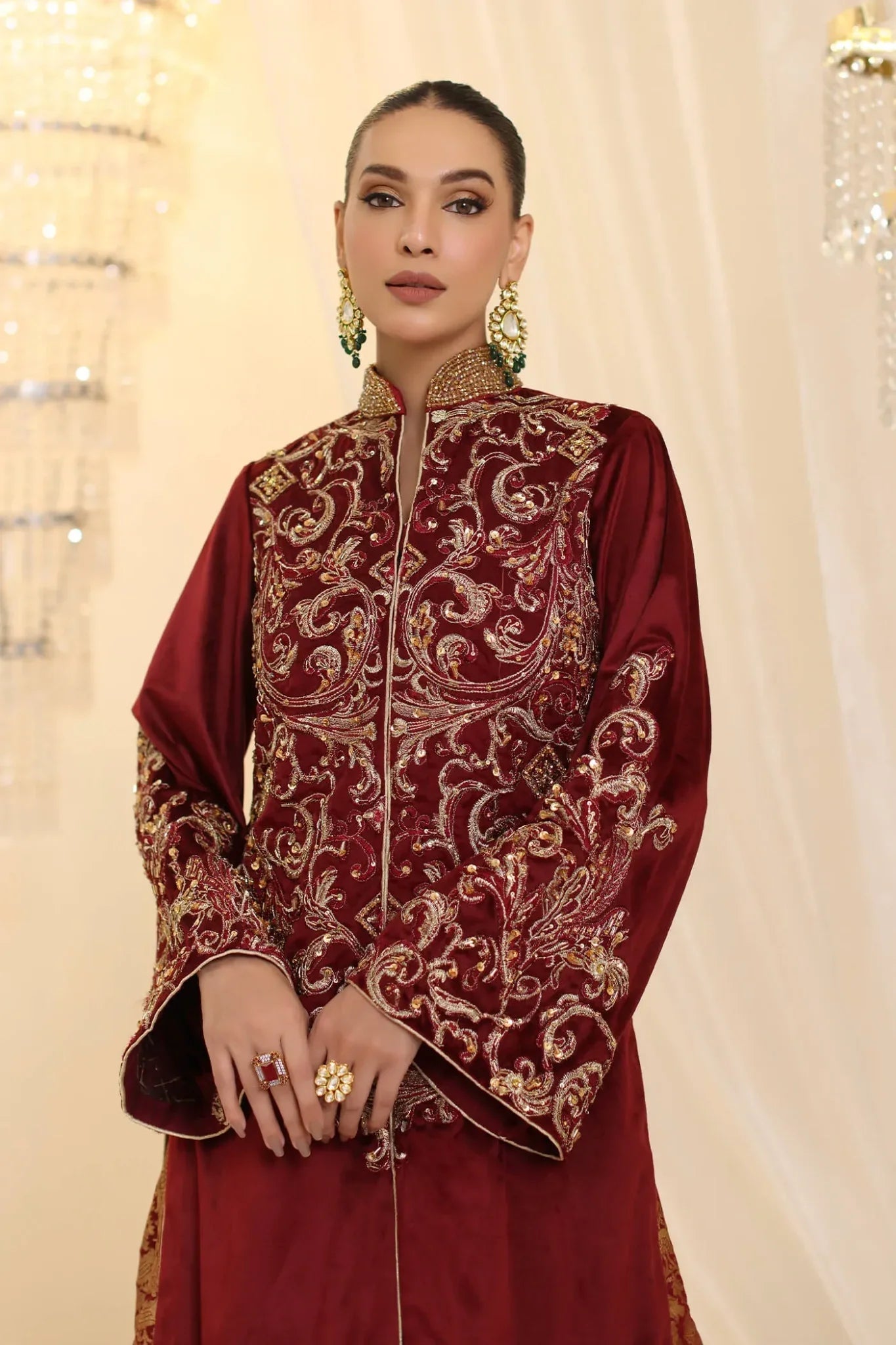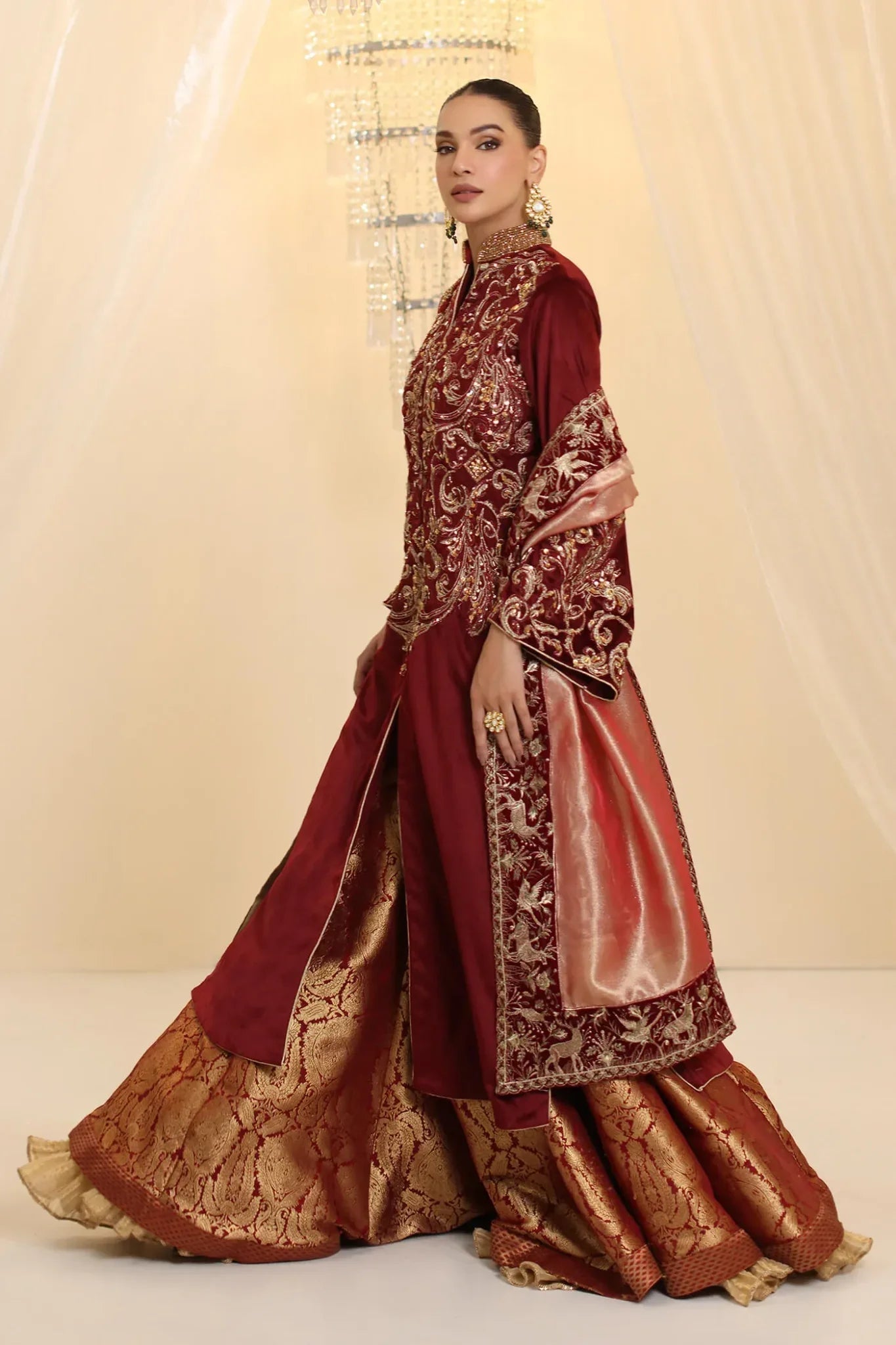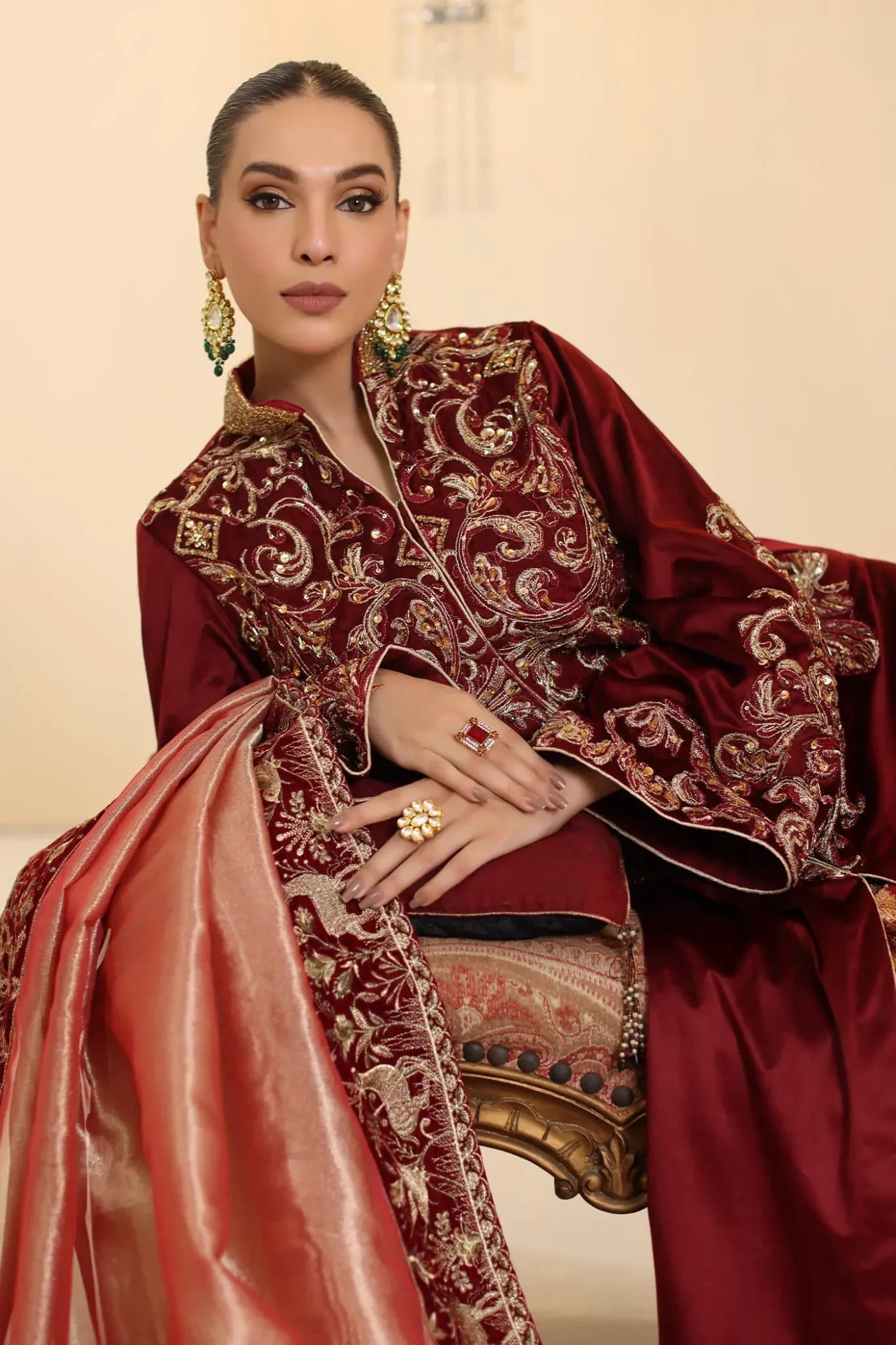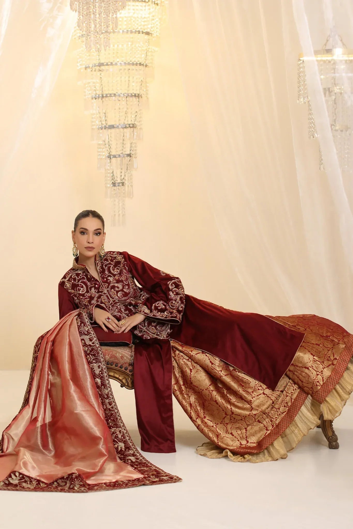 This exquisite ensemble epitomizes couture luxury with its sumptuous velvet shirt, intricately embroidered with resham and tilla work. Musferah Saad carefully curated the color enhancing the dazzling handwork, featuring a stunning combination of sequins, pipes, kora, pearls, and crystals, masterfully arranged with floral sequins. The design is further elevated with the addition of precious and semi-precious stones, alongside radiant Swarovski crystals, creating an opulent tapestry of detail and elegance. Paired with a regal kimkhab sharara, the ensemble radiates timeless sophistication. The look is completed with a tinsel dupatta, featuring an intricately embellished border, providing the perfect finishing touch to this statement couture piece ‘Grand Symphony ‘