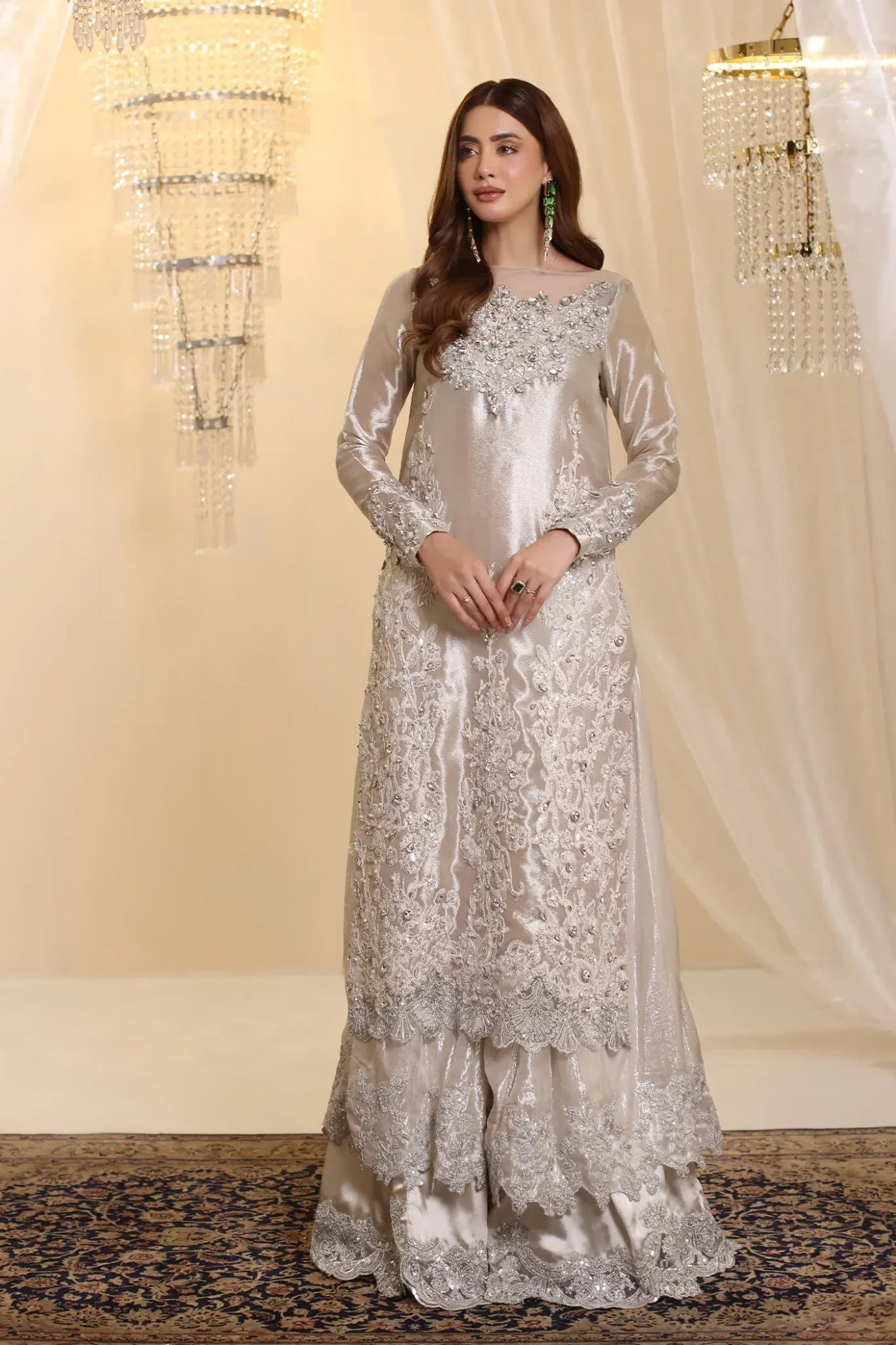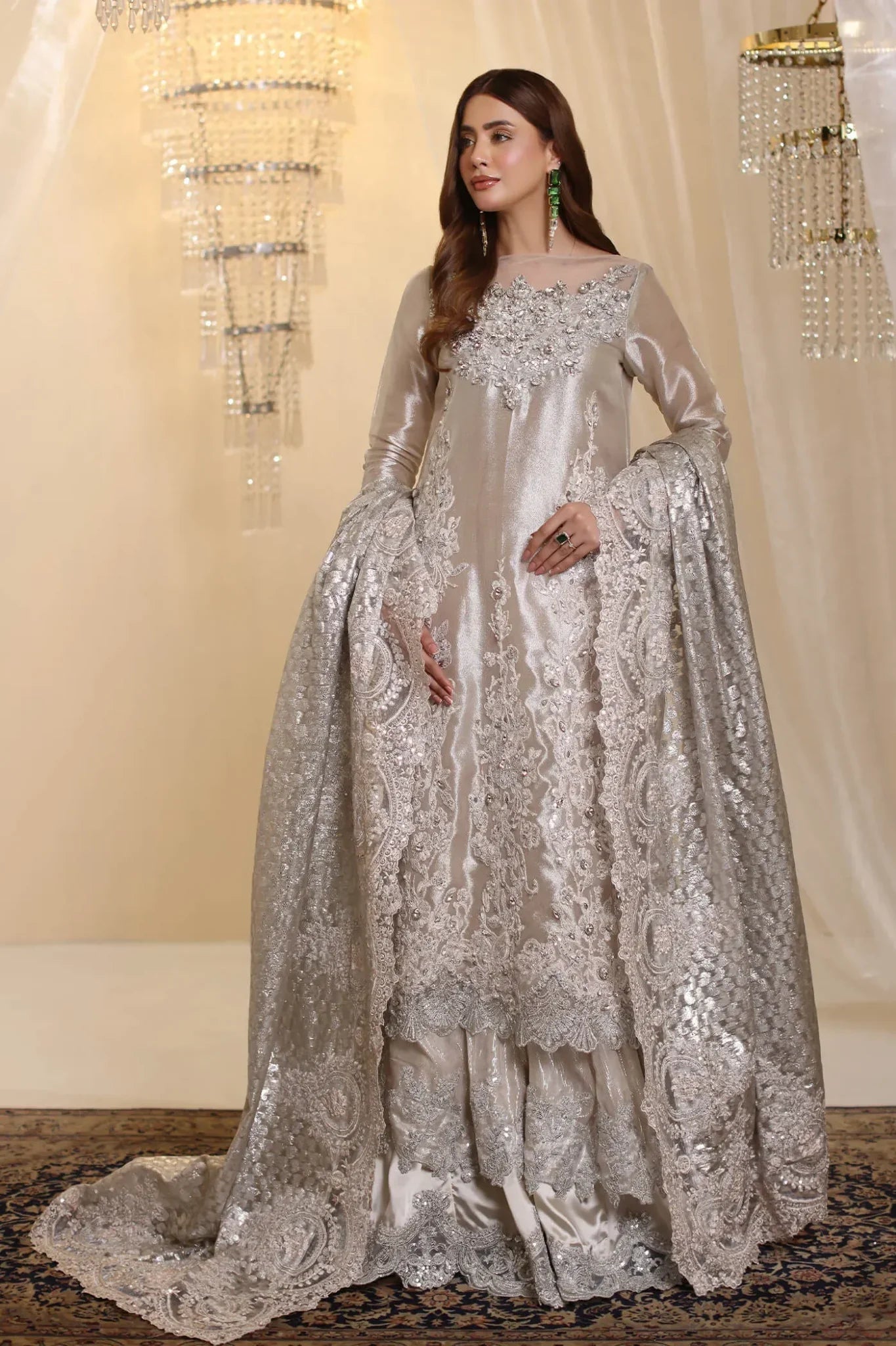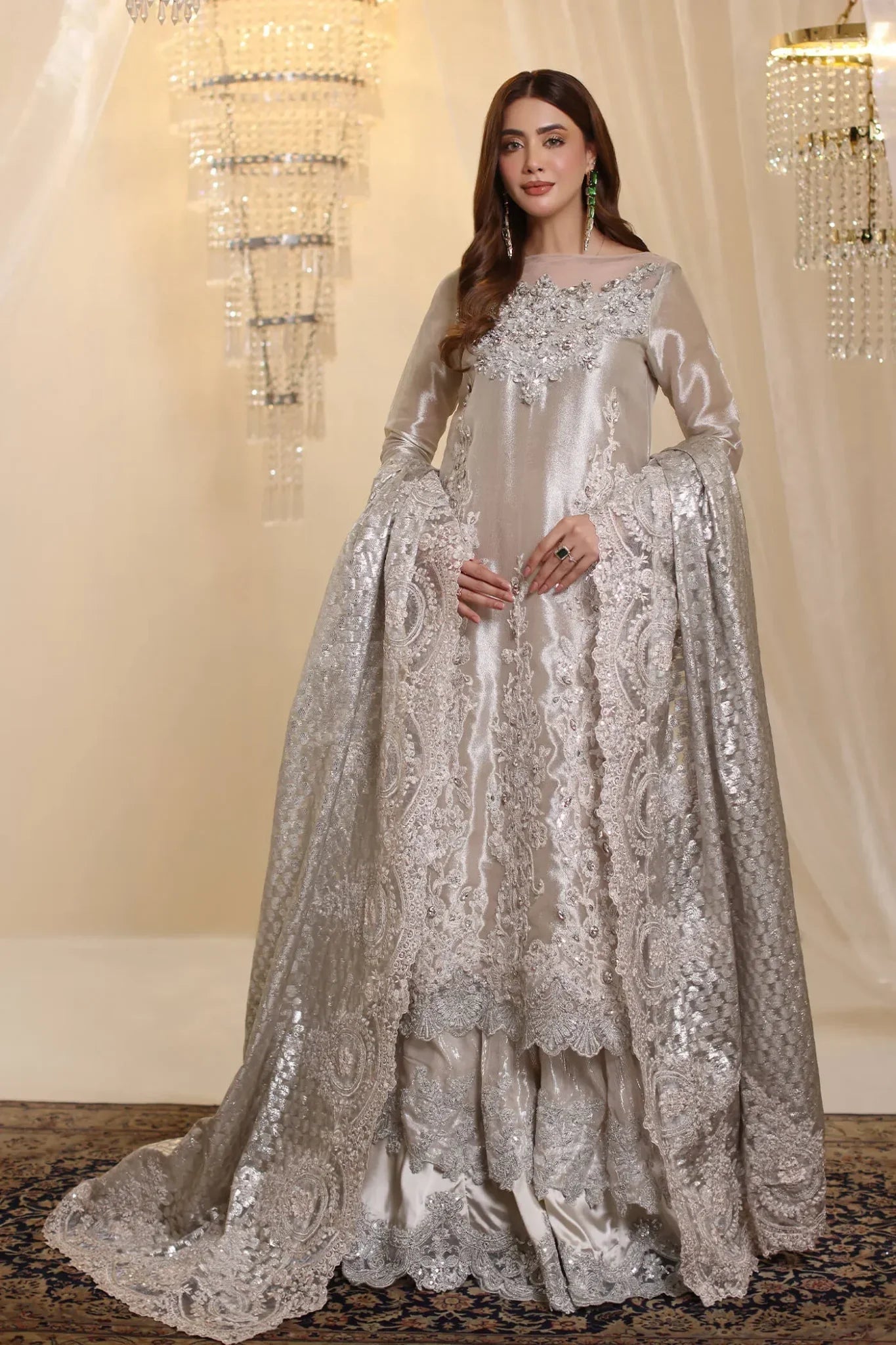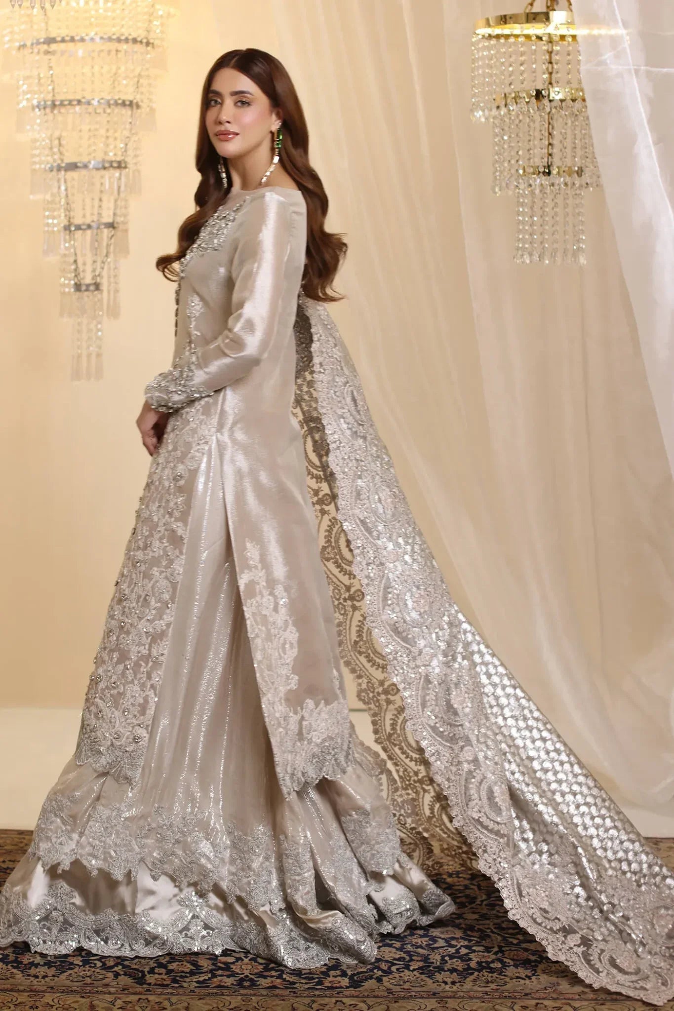 Illuminate your festive season with Lunar Radiance, a true couture masterpiece that embodies elegance and meticulous artistry. This stunning ensemble features intricate, hand-embellished details with shimmering Swarovski crystals, lustrous pearls, sequins, and delicate pipes, all arranged to create a breathtaking display of opulence. Every stitch reflects the dedication to craftsmanship, with the luxurious handwork exuding sophistication and grandeur. The ensemble is paired with double-layered, flared pants, adorned with an embroidered border that adds an extra layer of refinement and elegance. Completing the look is a tinsel dupatta, richly embellished with intricate sequined embroidery, perfectly harmonizing with the ensemble. Each element of Lunar Radiance is thoughtfully curated to craft an unforgettable statement of high couture, offering a timeless blend of luxury and style.