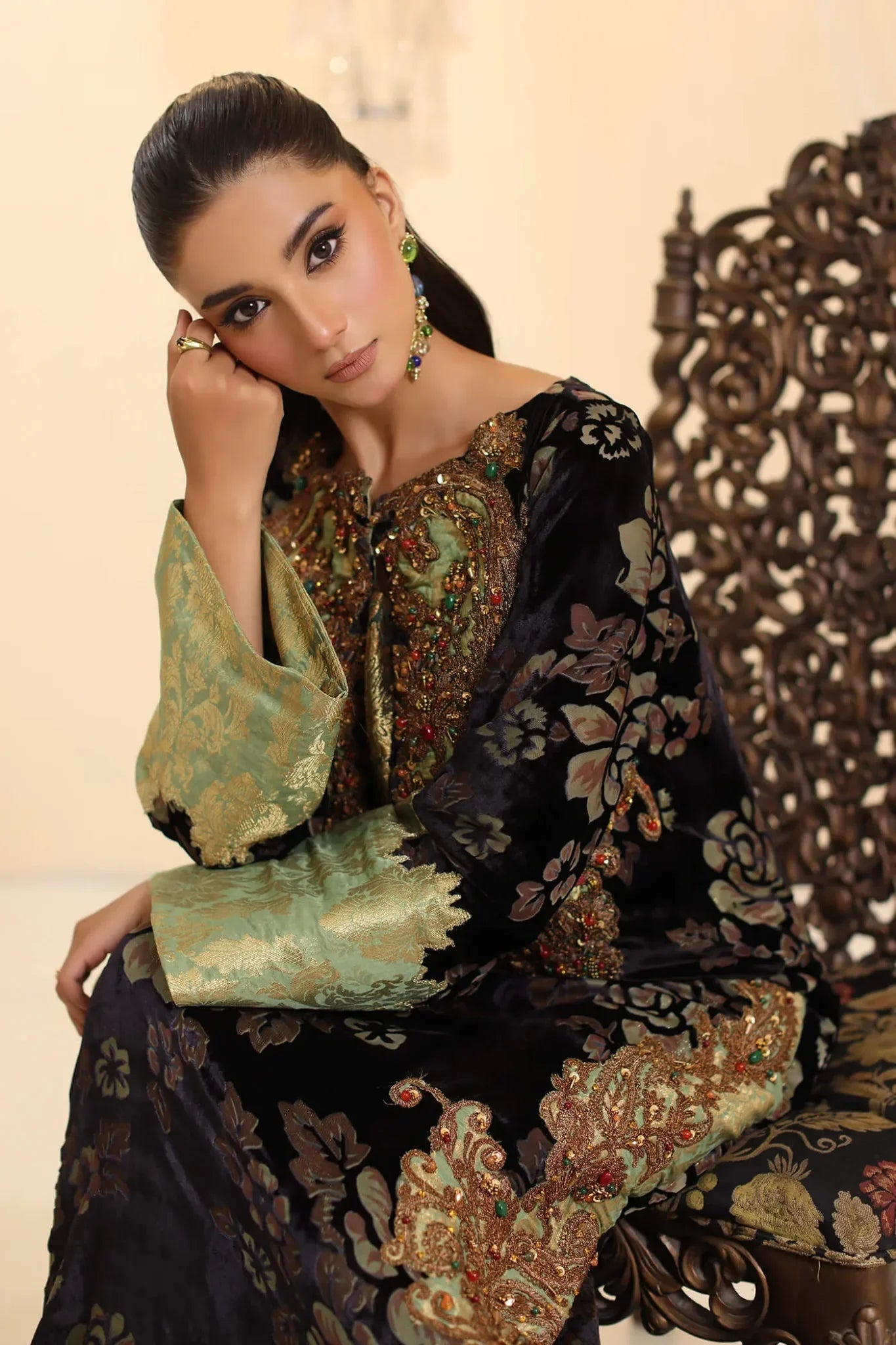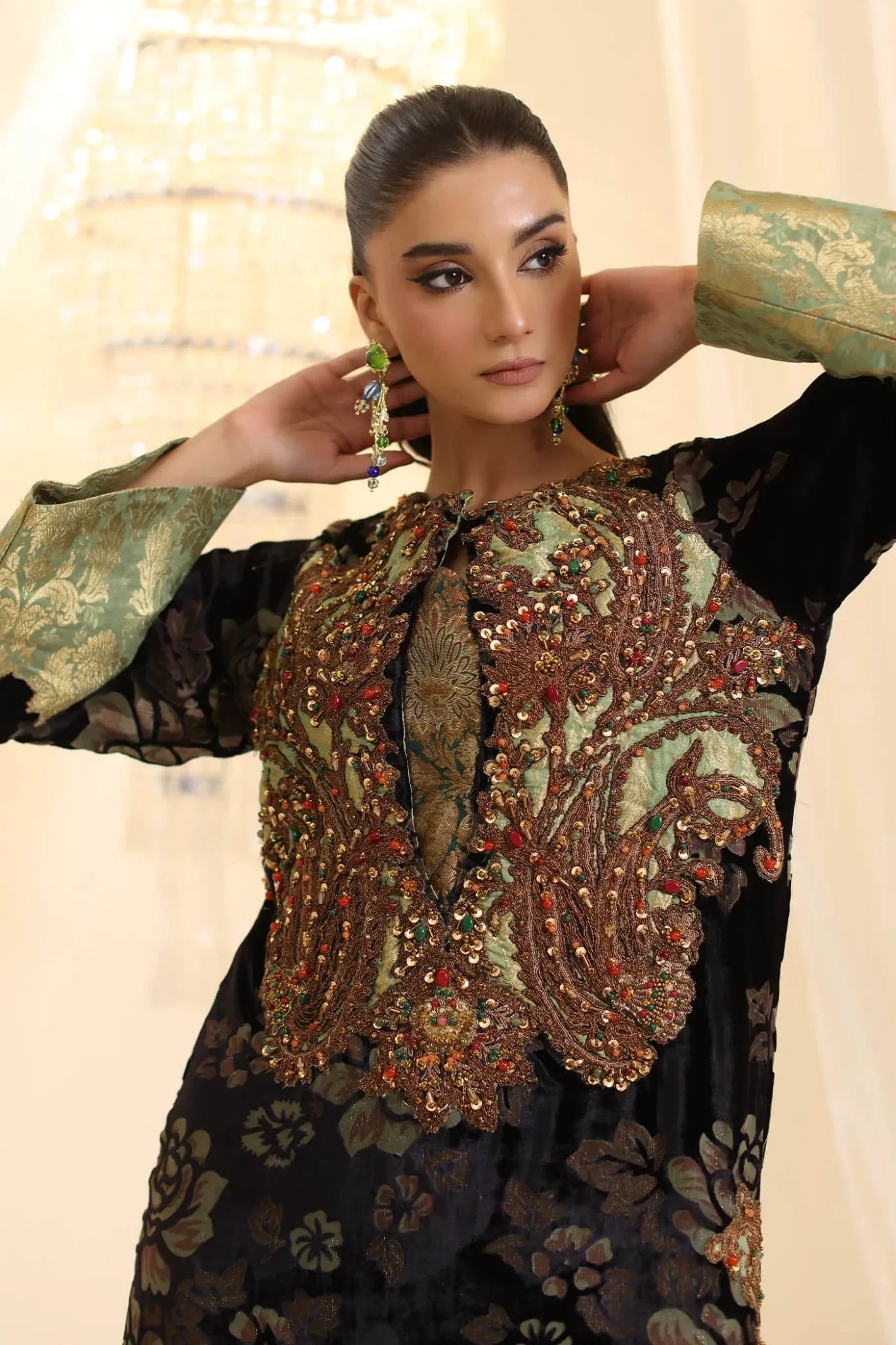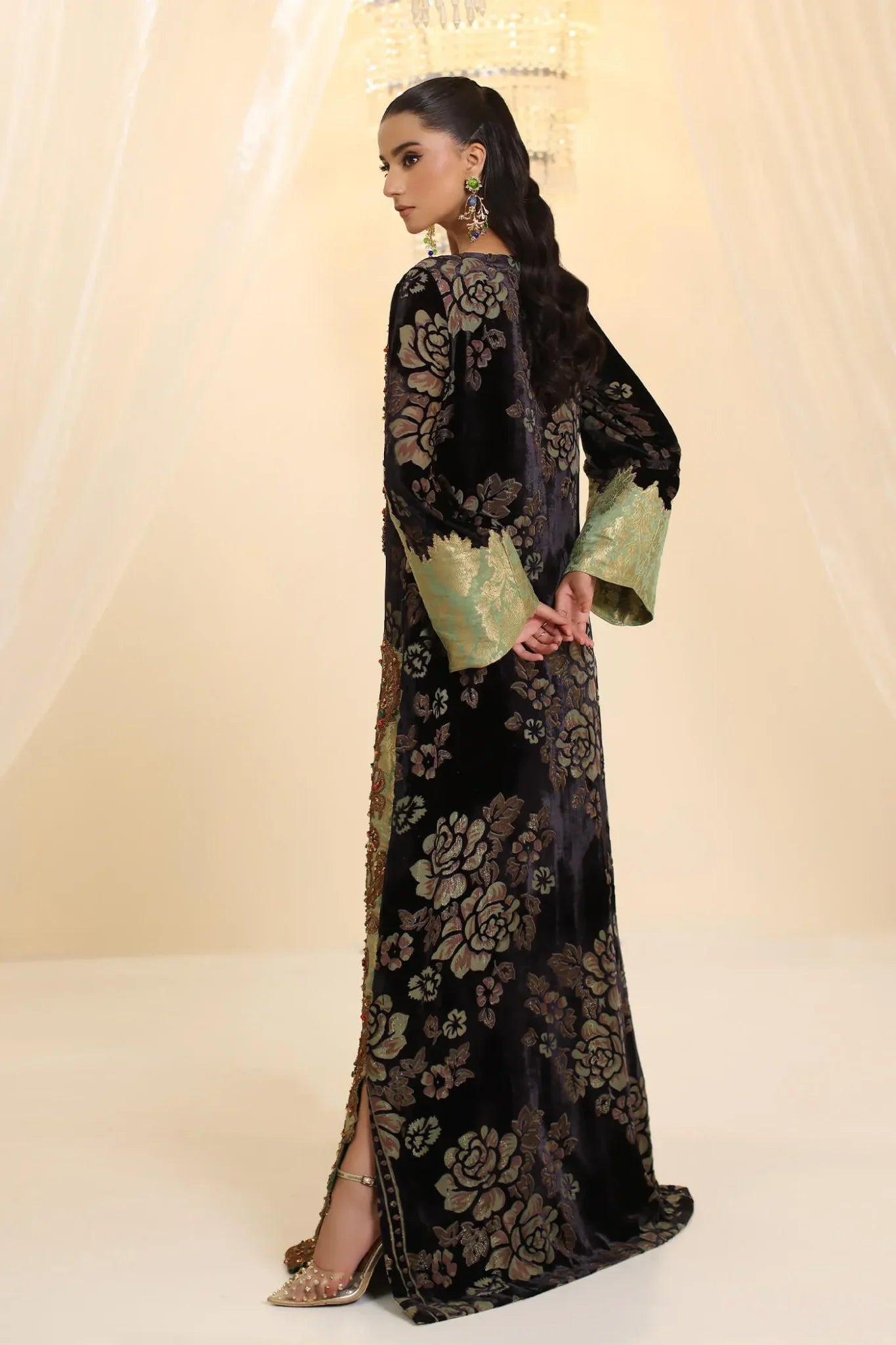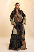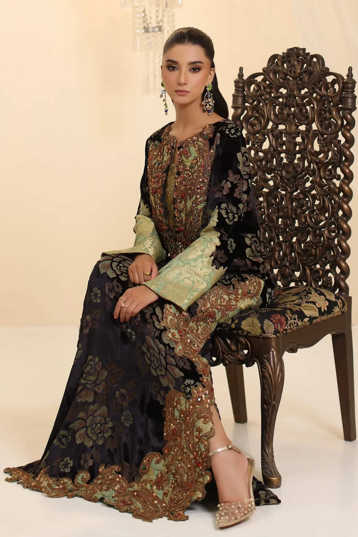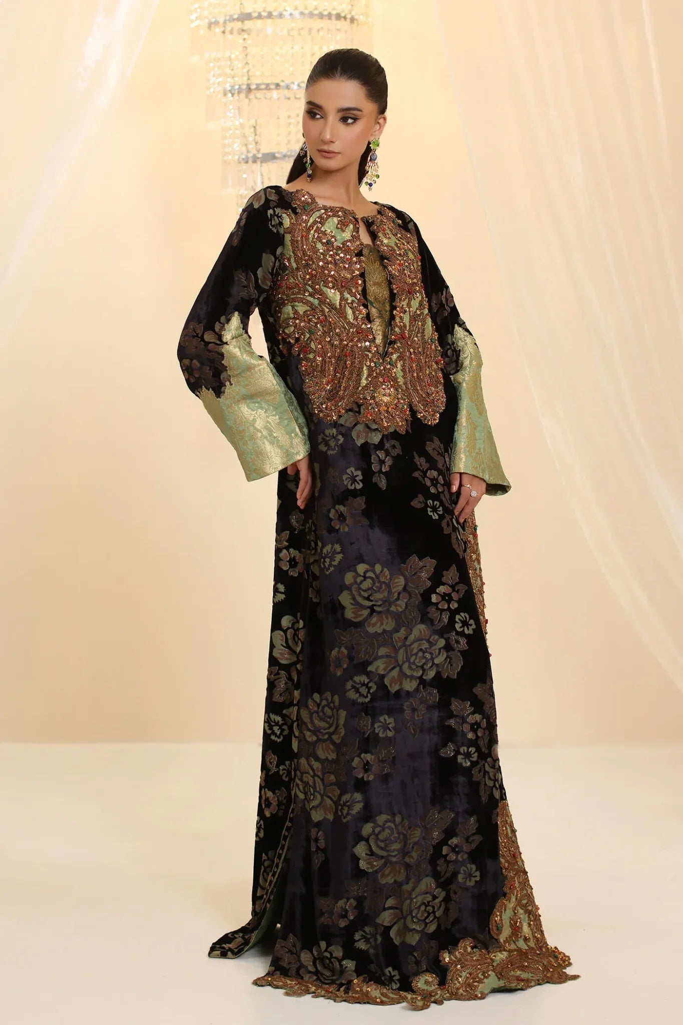 “Midnight Muse” is the epitome of timeless elegance, meticulously crafted from luxurious velvet devoré that radiates sophistication. The design is enhanced with intricate dori work complemented by lavish embellishments of precious and semi-precious stones, intertwined with sparkling gold Swarovski crystals and sequins of various shapes. Each element, from the shimmering sequins to the precisely placed stones, contributes to the articulated shapes that define the ensemble, showcasing the meticulous craftsmanship. This masterpiece is a true reflection of Musferah Saad’s design philosophy, where luxury, artistry, and structured elegance come together in perfect symphony.