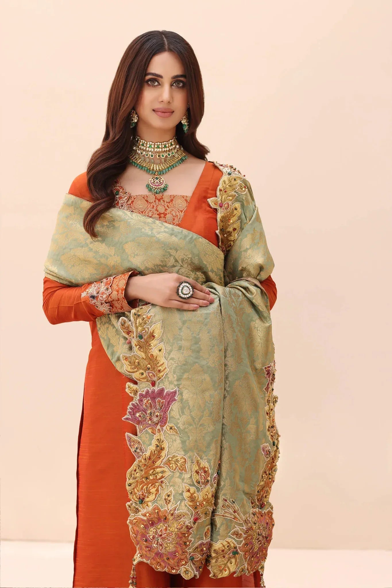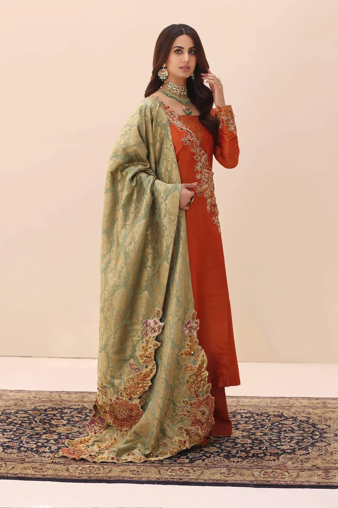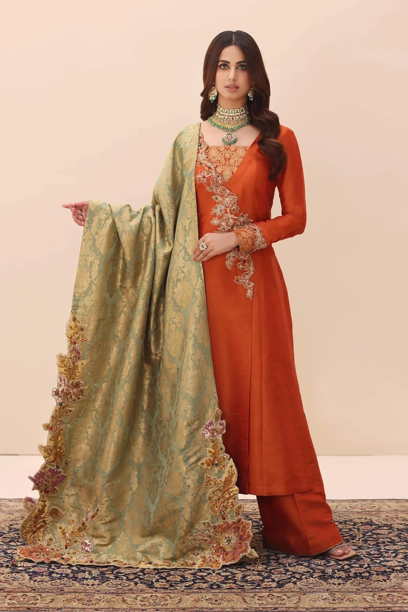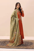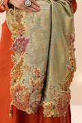 This kimkhaab shawl is a triumph of artisanal skill, presenting a lavishly embroidered pallu that blossoms with intricate floral details. Its beauty is magnified by an array of vibrant precious stones, each one catching the light in a dance of color. The radiance of Swarovski crystals adds to the spectacle, while the bespoke hand-made tassels anchor the piece in a deep tradition of authenticity. Musferah Saad has expertly matched this shawl with a captivating tangerine-hued premium raw silk shirt. The Tangerine Aura shirt boasts meticulously crafted embroidery on the neckline and sleeves—a testament to the art of detail. The Tangerine Aura ensemble is perfected with a pair of elegant pants, providing that unmistakable Musferah Saad panache.