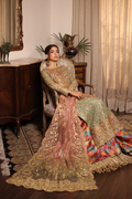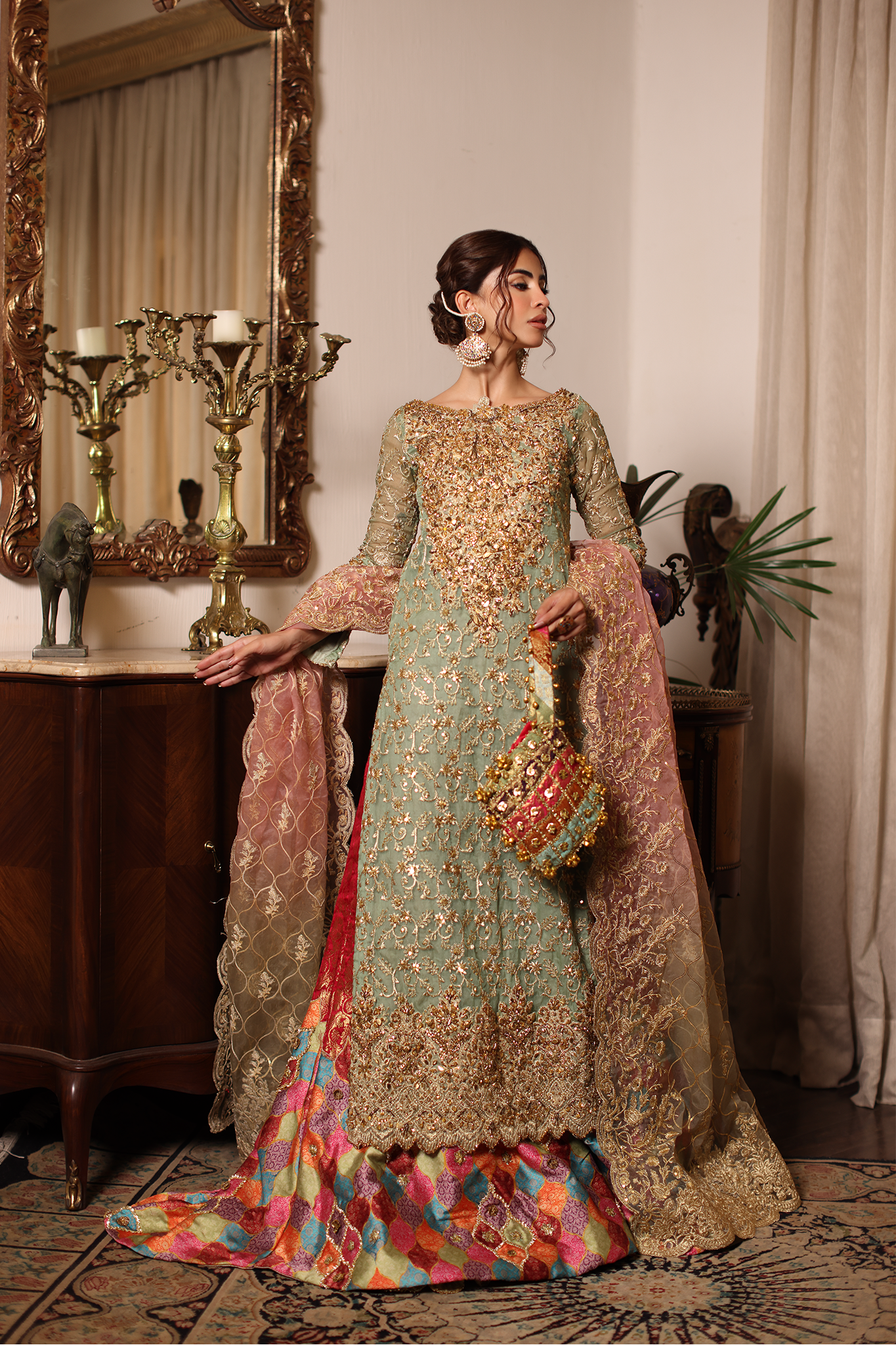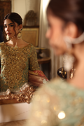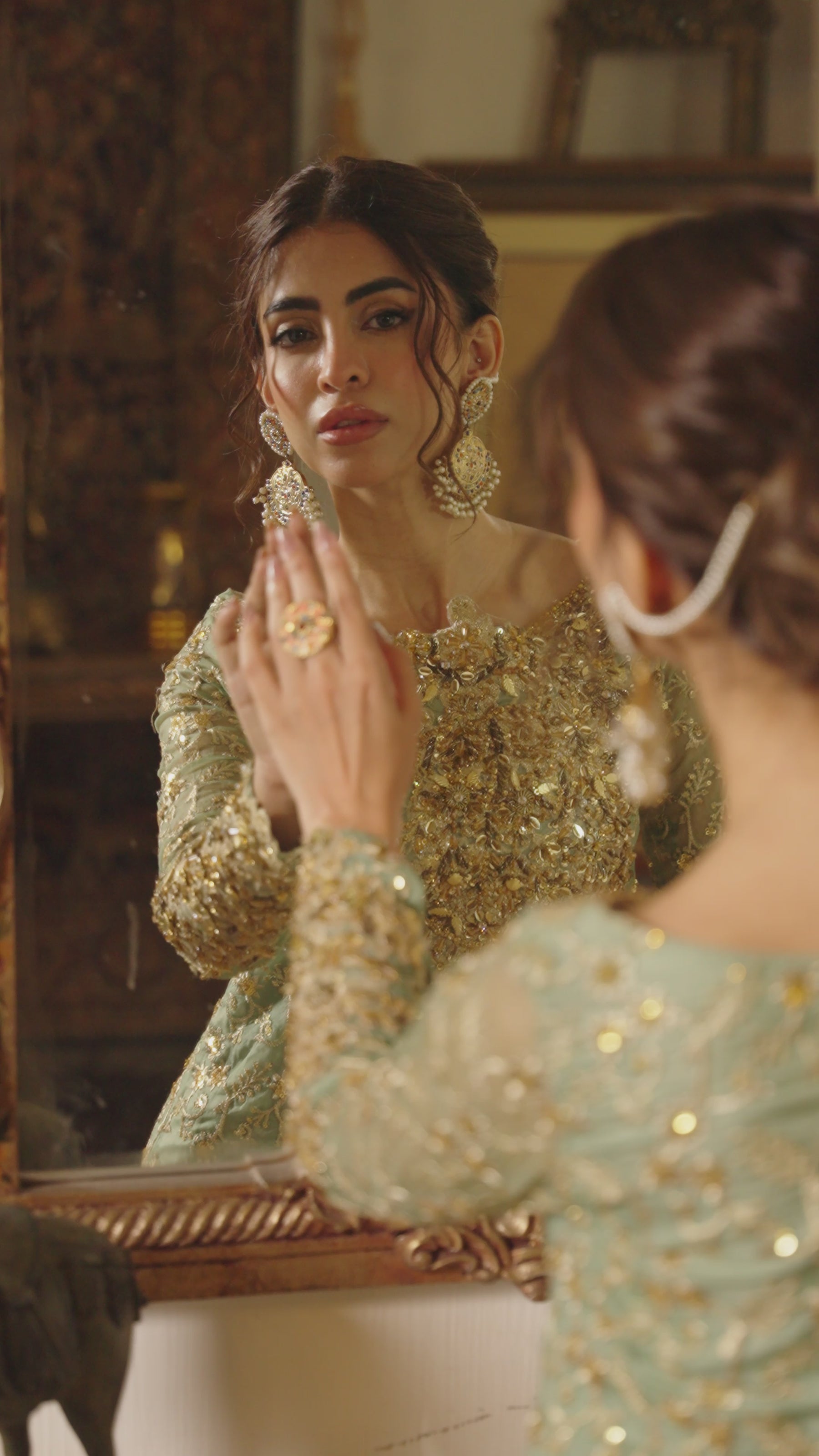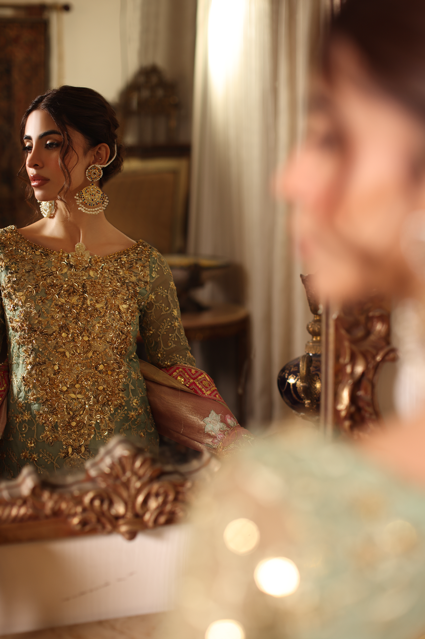 Elysian Verde brings the beauty of nature to couture form. In deep green tones with gorgeous gold hand embellishments, the silhouette flows with effortless sophistication. Couture handwork add depth and allure, while the subtle play of texture and color reflects a harmony between earth and elegance. A masterpiece that celebrates refined opulence and timeless artistry. Extensive research and hours of meticulous handwork by Musferah Saad’s atelier lend this design its couture finesse — timeless, radiant, and impossibly chic.
