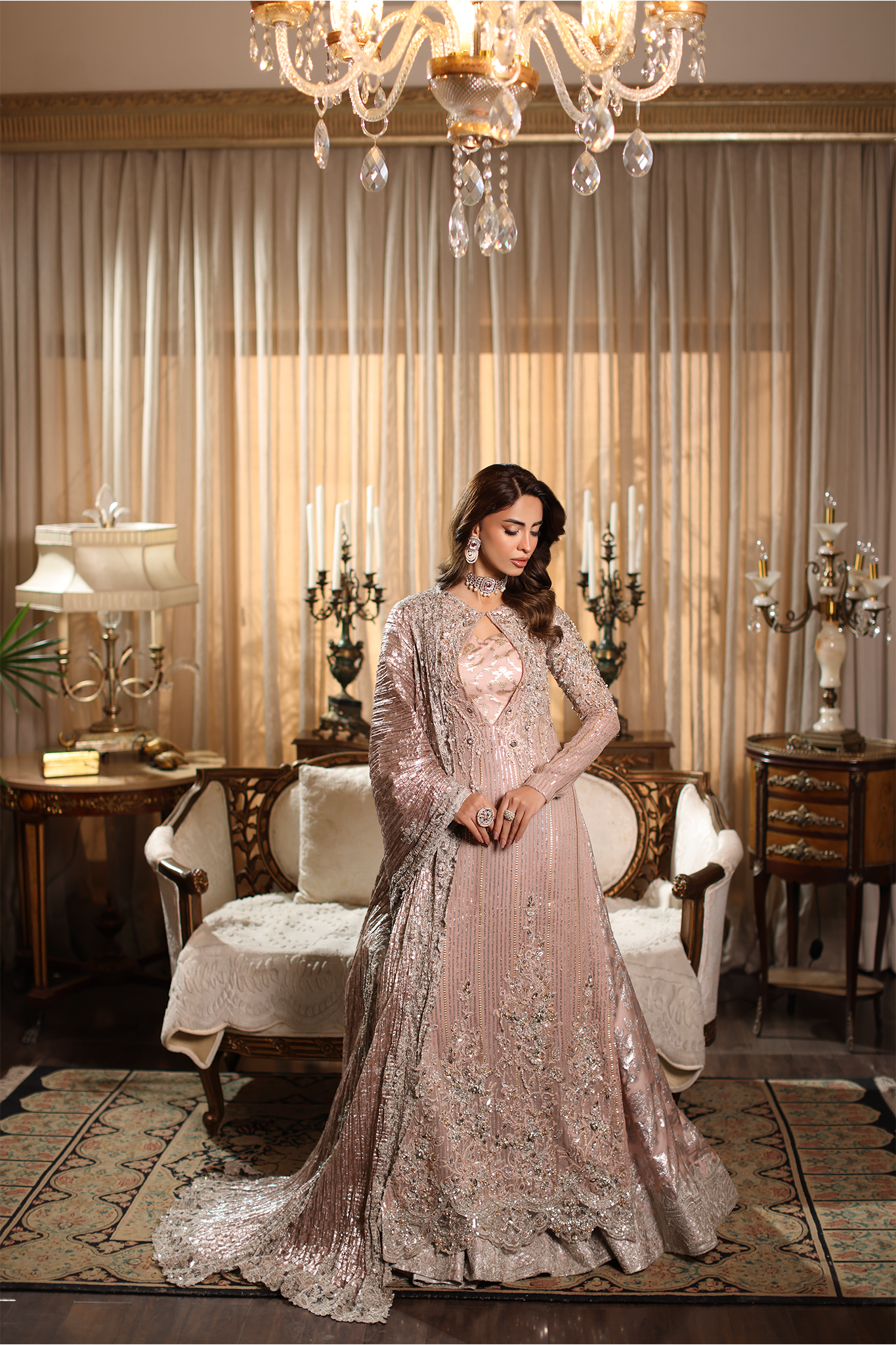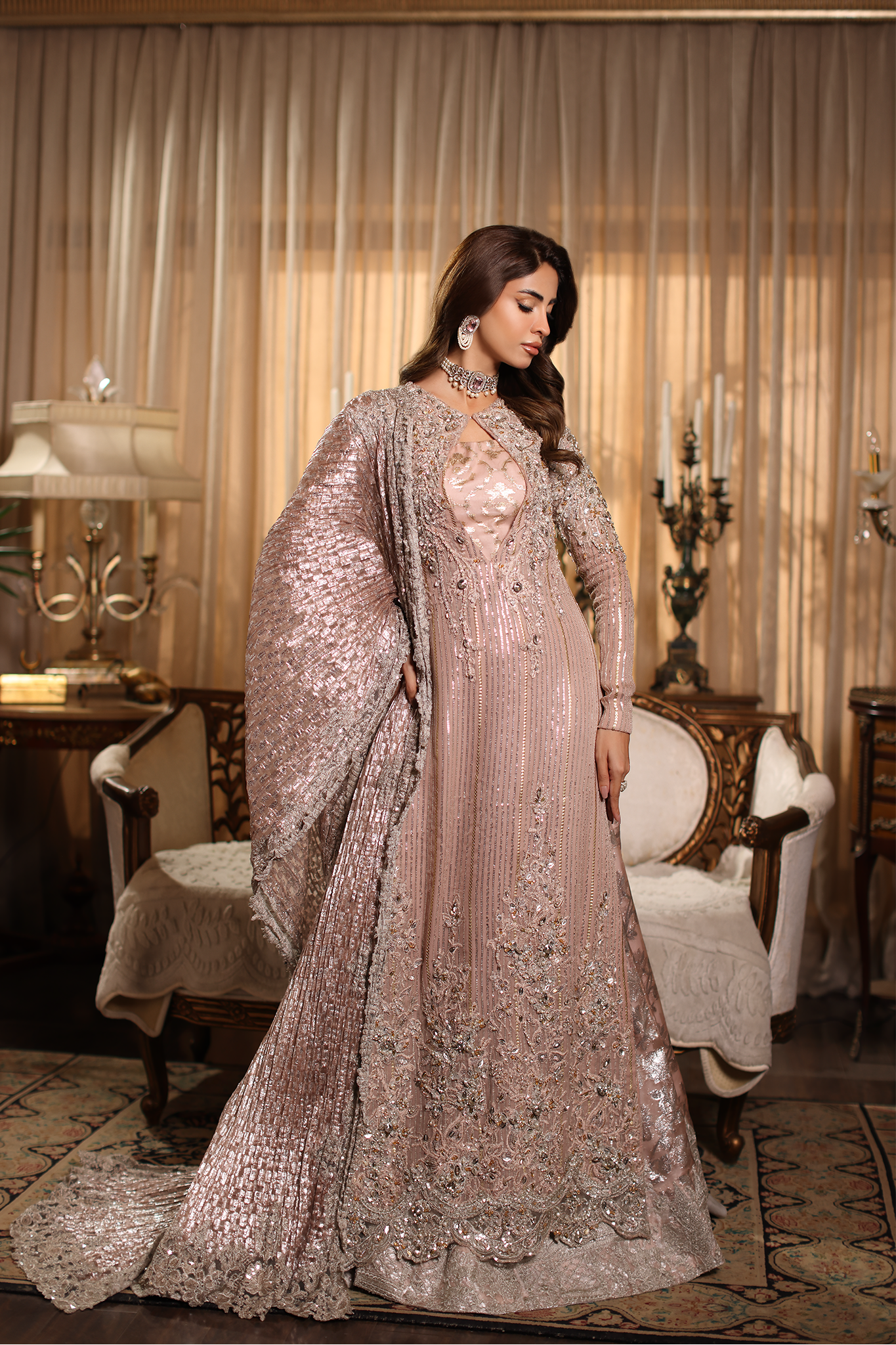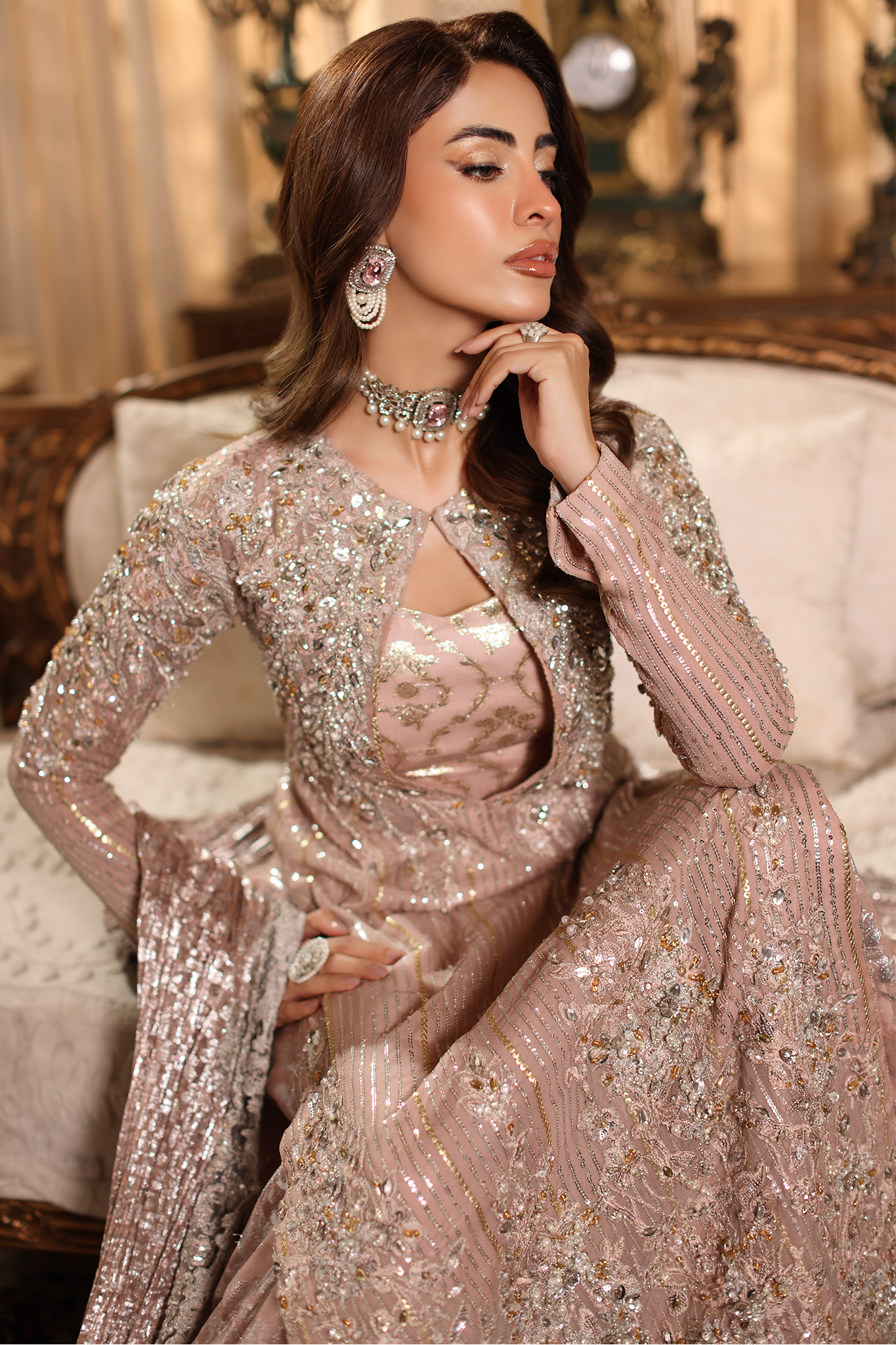 Soft, romantic, and endlessly graceful — Rosé Whispers captures the gentle spirit of femininity in motion. Crafted in delicate pink hues, it features refined embroidery and luminous hand embellishments that evoke the timeless elegance of a rose in bloom. Every detail reflects Musferah Saad’s devotion to hand artistry — whispering of beauty, poise, and couture serenity.