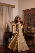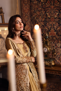 Sunlit Grace evokes the golden warmth of daylight woven into couture. The silhouette reflects refined tailoring with delicate embellishment, blending tradition with effortless sophistication. Intricate gold tilla and resham embroidery illuminate the design, creating a glowing harmony of texture and elegance. Each element, from stitch to shimmer, is shaped through painstaking handwork — a radiant expression of modern regality.