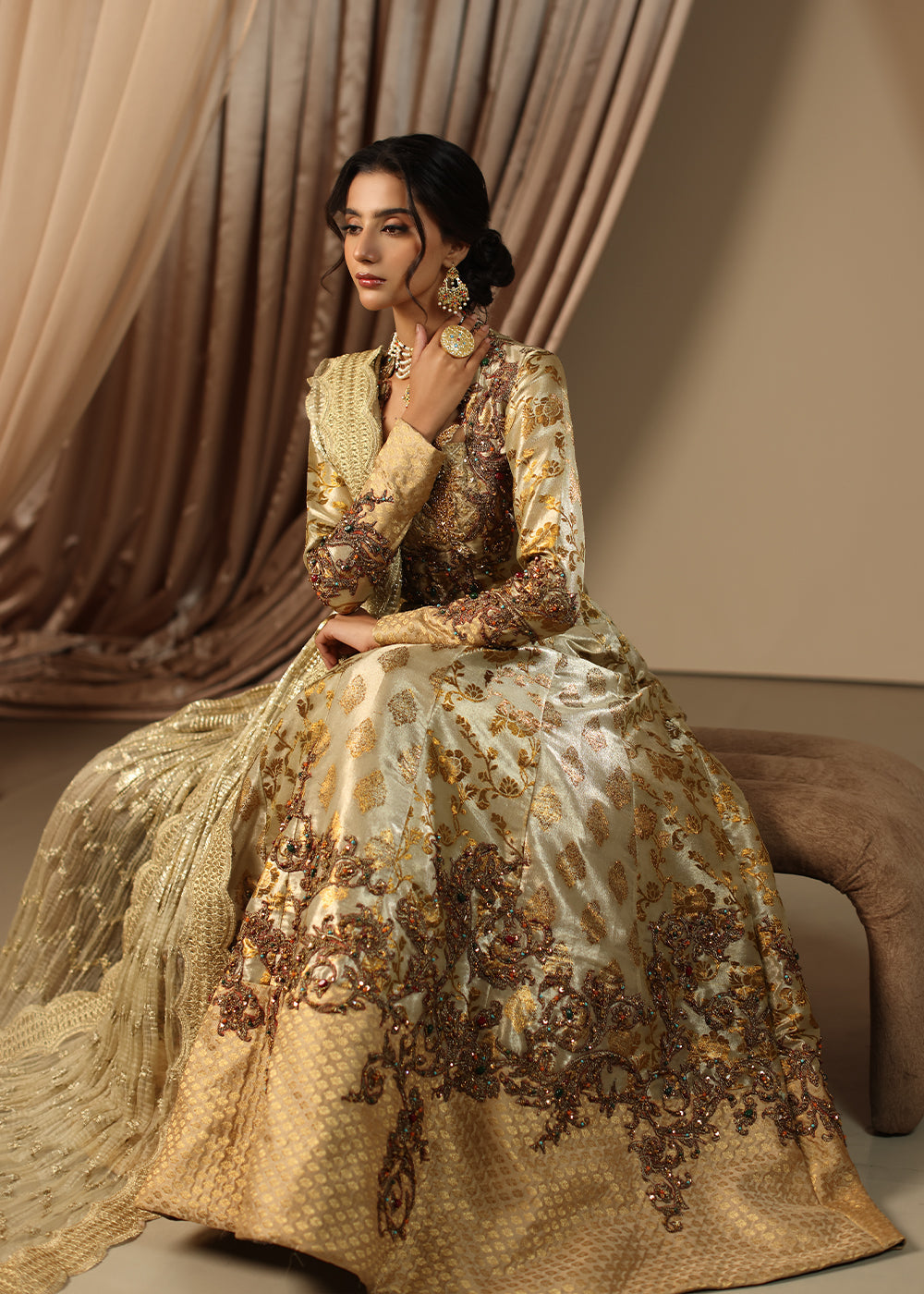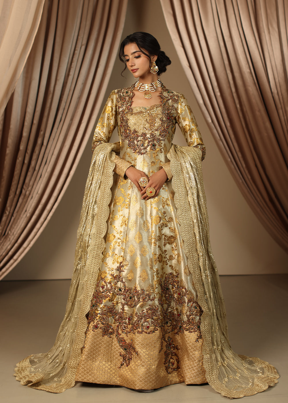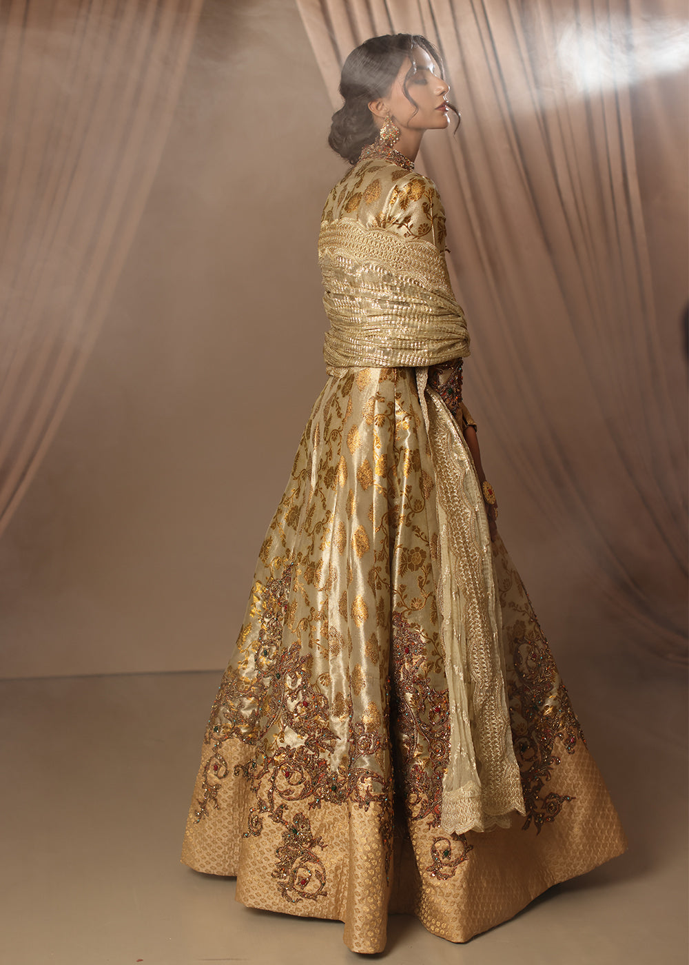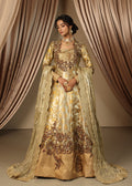 Eternal Grace is a masterpiece of timeless sophistication, radiating elegance in a stunning antique gold. This multi-paneled couture peshwas, crafted from the fusion of two exquisite types of kimkhab, exudes true grandeur.