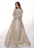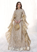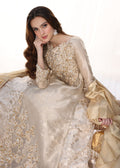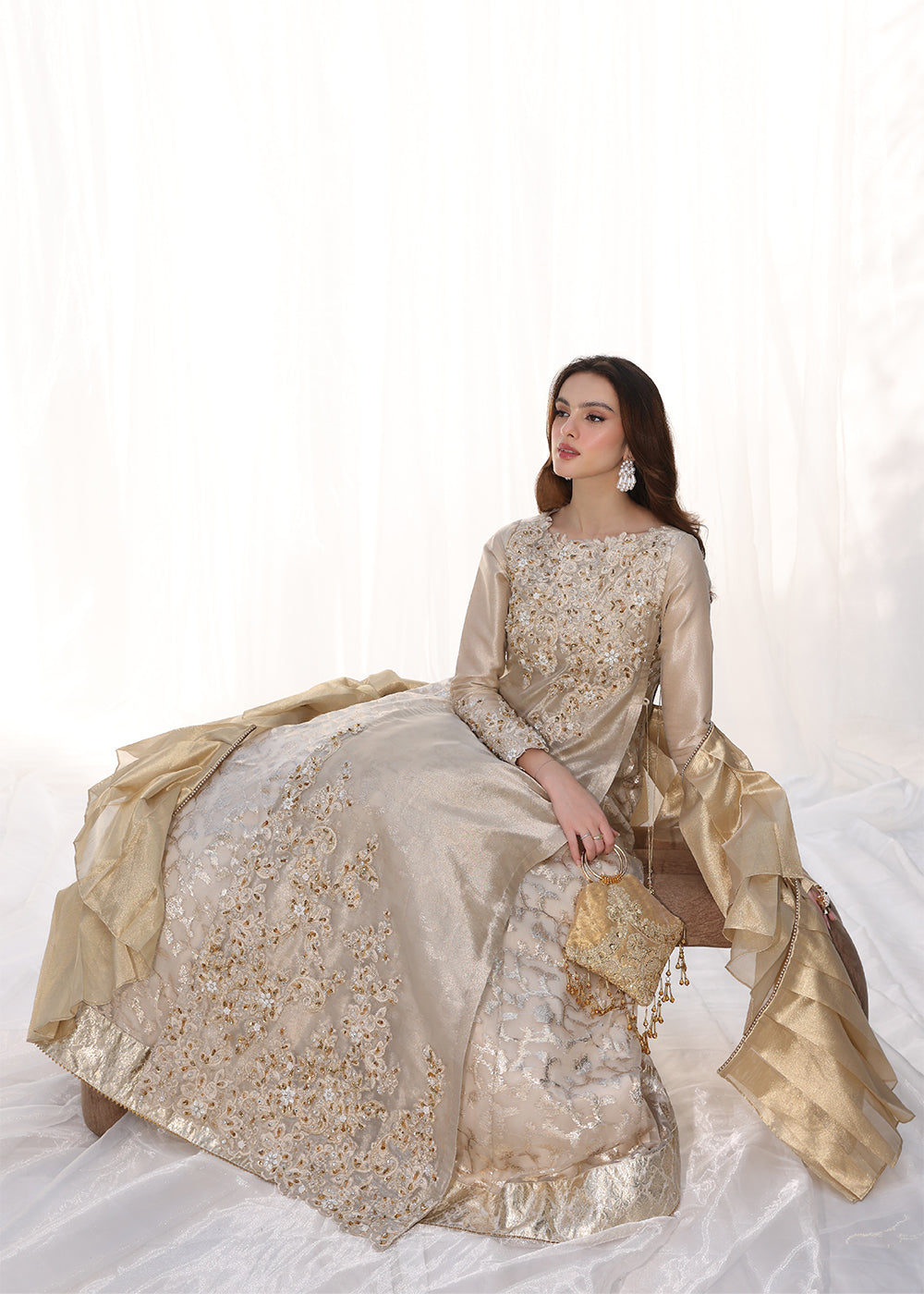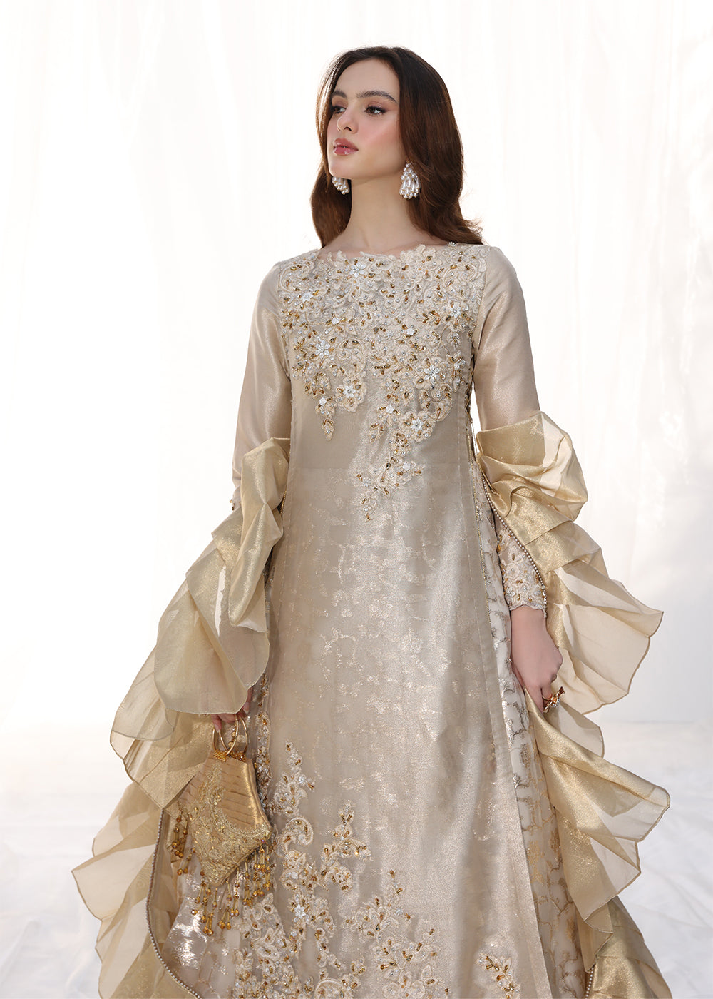This gorgeous sunlit Peshwas is adorned with delicate tilla and Resham embroidery, further handworked with golden and ivory crystals, shimmering beads, sequins, etched crystal beads. Intricately designed 3D asymmetrical flowers add a chic touch, elevating the ensemble’s luxurious appeal. The dual layer, crafted from tensile organza in panels, enhances the peshwas with flowing grace and dimension.