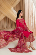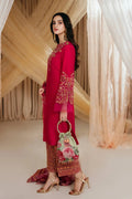 “Radiant Bloom” – an embodiment of sheer splendor. This exquisite creation is distinguished by its stunning color palette, meticulously adorned with intricate embroideries and handwork. Featuring a delightful fusion of sequins, pearls, gotta work, and leaf designs. Musferah Saad artisticly paired it with gorgeous heavily embroidered raw silk pants that brings this whole outfit together, with detailed embroidery and intricate handwork featuring a delightful combination of sequins, tilla, and gotta work on the hem styled with a beautiful, printed dupatta.. The bold and vibrant hue of “Radiant Bloom” ensures you make a statement everywhere you go.